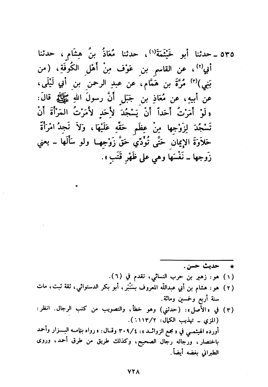 535 - حَدَّثَنَا أَبُو خَيْثَمَةَ، حَدَّثَنَا مُعَاذُ بْنُ هِشَامٍ، حَدَّثَنَا أَبِي، عَنِ الْقَاسِمِ بْنِ عَوْفٍ، مِنْ أَهْلِ الْكُوفَةِ مِنْ بَنِي مُرَّةَ بْنِ هَمَّامٍ، عَنْ عَبْدِ الرَّحْمَنِ بْنِ أَبِي لَيْلَى، عَنْ أَبِيهِ، عَنْ مُعَاذِ بْنِ جَبَلٍ، أَنَّ رَسُولَ اللَّهِ صَلَّى اللهُ عَلَيْهِ وَسَلَّمَ قَالَ: «§لَوْ أَمَرْتُ أَحَدًا أَنْ يَسْجُدَ لِأَحَدٍ لَأَمَرْتُ الْمَرْأَةَ أَنْ تَسْجُدَ لِزَوْجِهَا مِنْ عِظَمِ حَقِّهِ عَلَيْهَا وَلَا تَجِدُ امْرَأَةٍ حَلَاوَةَ الْأَيْمَانِ حَتَّى تُؤَدِّيَ حَقَّ زَوْجِهَا وَلَوْ سَأَلَهَا - يَعْنِي زَوْجُهَا - نَفْسَهَا وَهِيَ عَلَى ظَهْرِ قَتَبٍ»