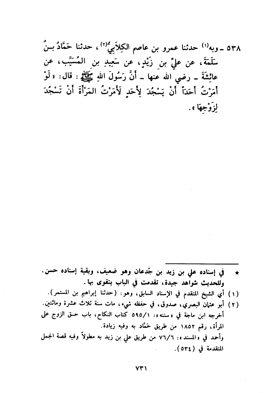 538 - وَبِهِ حَدَّثَنَا عَمْرُو بْنُ عَاصِمٍ الْكِلَابِيُّ، حَدَّثَنَا حَمَّادُ بْنُ سَلَمَةَ، عَنْ عَلِيِّ بْنِ زَيْدٍ، عَنْ سَعِيدِ بْنِ الْمُسَيِّبِ، عَنْ عَائِشَةَ، رَضِيَ اللَّهُ عَنْهَا أَنَّ رَسُولَ اللَّهِ صَلَّى اللهُ عَلَيْهِ وَسَلَّمَ قَالَ: «§لَوْ أَمَرْتُ أَحَدًا أَنْ يَسْجُدَ لِأَحَدٍ لَأَمَرْتُ الْمَرْأَةَ أَنْ تَسْجُدَ لِزَوْجِهَا»