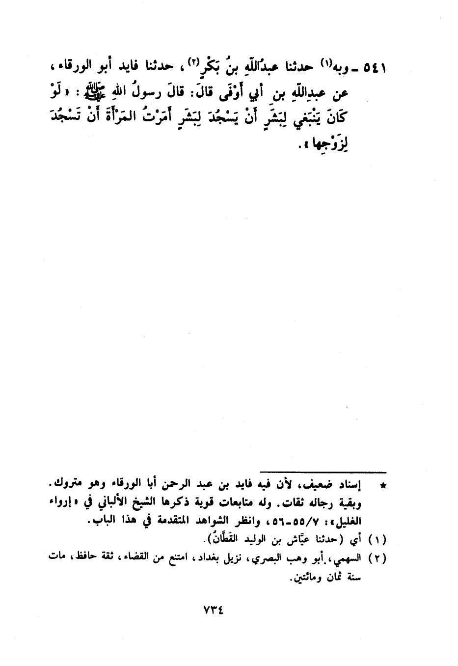 541 - وَبِهِ حَدَّثَنَا عَبْدُ اللَّهِ بْنُ بَكْرٍ، حَدَّثَنَا فَائِدٌ أَبُو الْوَرْقَاءِ، عَنْ عَبْدِ اللَّهِ بْنِ أَبِي أَوْفَى، قَالَ: قَالَ رَسُولُ اللَّهِ صَلَّى اللهُ عَلَيْهِ وَسَلَّمَ: «§لَوْ كَانَ يَنْبَغِي لِبَشَرٍ أَنْ يَسْجُدَ لِبَشَرٍ أَمَرْتُ الْمَرْأَةَ أَنْ تَسْجُدَ لِزَوْجِهَا»