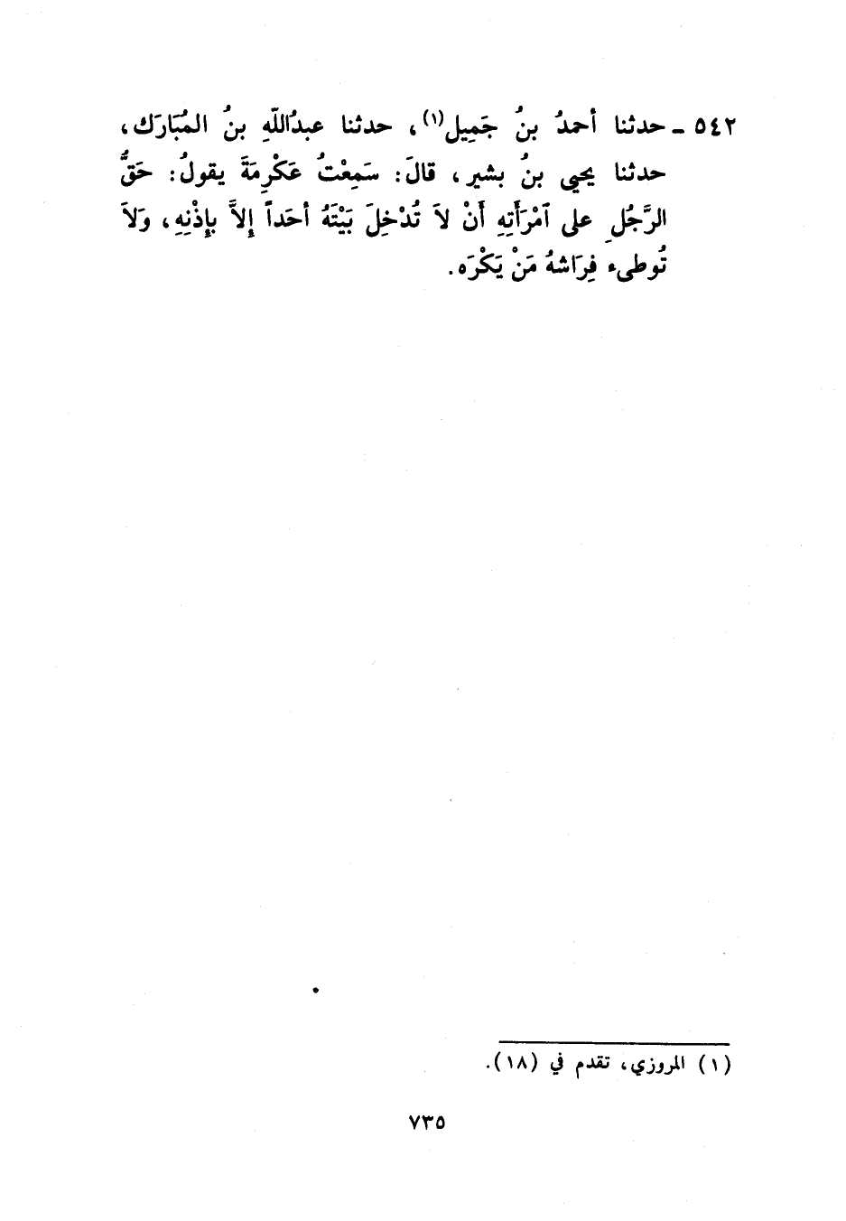 542 - حَدَّثَنَا أَحْمَدُ بْنُ جَمِيلٍ، حَدَّثَنَا عَبْدُ اللَّهِ بْنُ الْمُبَارَكِ، حَدَّثَنَا يَحْيَى بْنُ بَشِيرٍ، قَالَ: سَمِعْتُ عِكْرِمَةَ، يَقُولُ: «§حَقُّ الرَّجُلِ عَلَى امْرَأَتِهِ أَنْ لَا تُدْخِلَ بَيْتَهُ أَحَدًا إِلَّا بِإِذْنِهِ وَلَا تُوطِئَ فِرَاشَهُ مَنْ يَكْرَهُ»