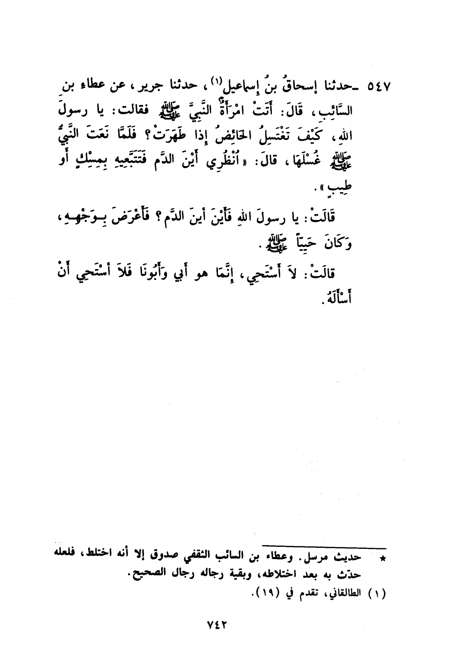 547 - حَدَّثَنَا إِسْحَاقُ بْنُ إِسْمَاعِيلَ، حَدَّثَنَا جَرِيرٌ، عَنْ عَطَاءِ بْنِ السَّائِبِ، قَالَ: أَتَتِ امْرَأَةٌ النَّبِيَّ صَلَّى اللهُ عَلَيْهِ وَسَلَّمَ فَقَالَتْ: يَا رَسُولَ اللَّهِ، كَيْفَ تَغْتَسِلُ الْحَائِضُ إِذَا طَهُرَتْ؟ فَلَمَّا نَعَتَ النَّبِيُّ صَلَّى اللهُ عَلَيْهِ وَسَلَّمَ غُسْلَهَا قَالَ: «§انْظُرِي أَيْنَ الدَّمُ فَتَتَبَّعِيهِ بِمِسْكٍ أَوْ طِيبٍ» قَالَتْ: يَا رَسُولَ اللَّهِ، فَأَيْنَ أَيْنَ الدَّمُ؟ فَأَعْرَضَ بِوَجْهِهِ وَكَانَ حَيِيًّا صَلَّى اللهُ عَلَيْهِ وَسَلَّمَ قَالَتْ: لَا أَسْتَحْيِي إِنَّمَا هُوَ أَبِي وَأَبُونَا فَلَا أَسْتَحْيِي أَنْ أَسْأَلَهُ