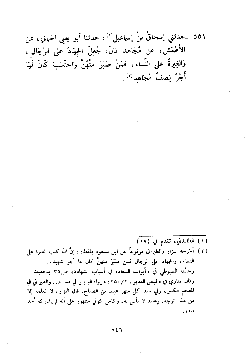 551 - حَدَّثَنِي إِسْحَاقُ بْنُ إِسْمَاعِيلَ، حَدَّثَنَا أَبُو يَحْيَى الْحِمَّانِيُّ، عَنِ الْأَعْمَشِ، عَنْ مُجَاهِدٍ، قَالَ: «§جُعِلَ الْجِهَادُ عَلَى الرِّجَالِ وَالْغِيرَةُ عَلَى النِّسَاءِ فَمَنْ صَبَرَ مِنْهُنَّ وَاحْتَسَبَ كَانَ لَهَا أَجْرُ نِصْفِ مُجَاهِدٍ»