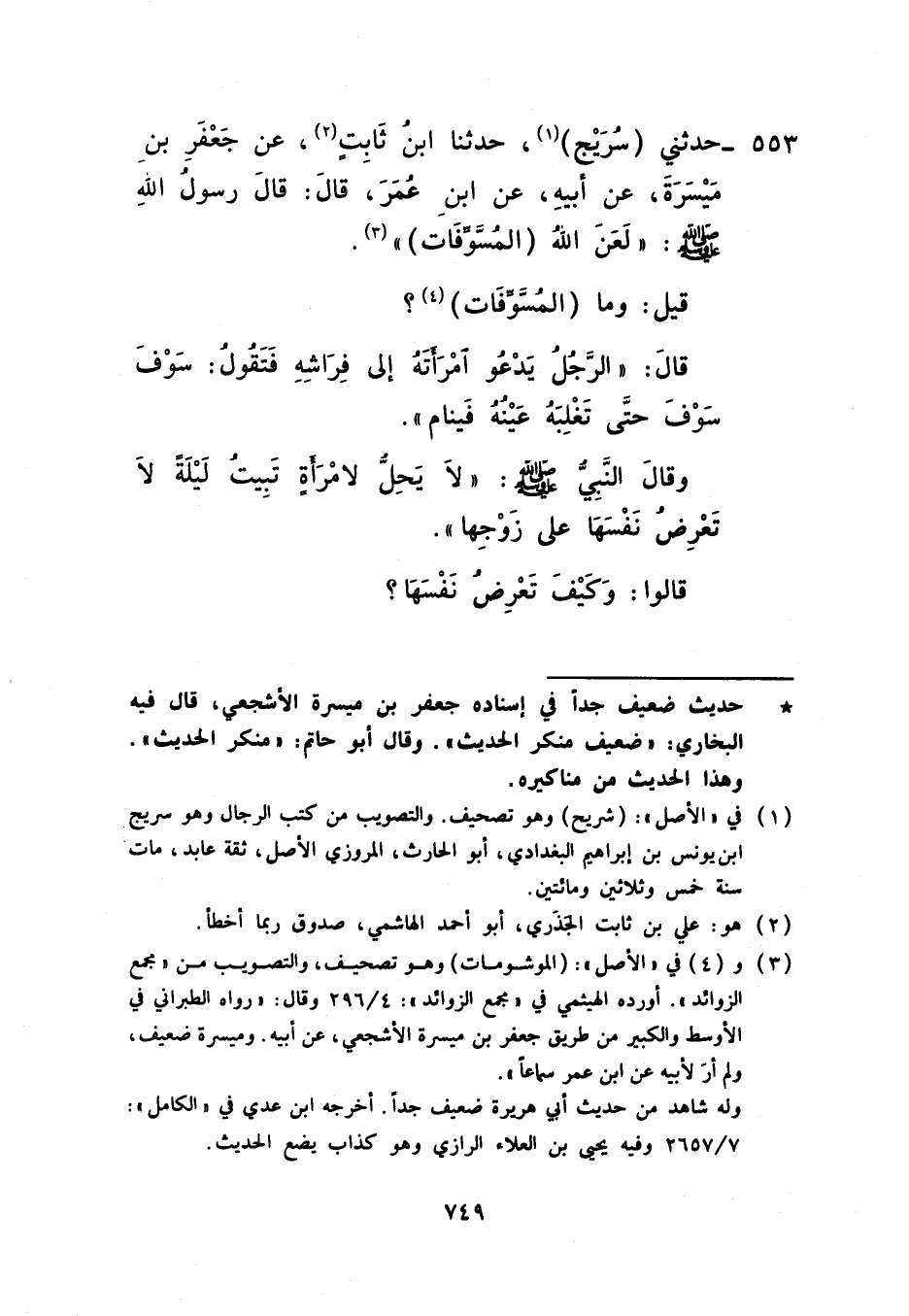 553 - حَدَّثَنِي سُرَيْجٌ، حَدَّثَنَا ابْنُ ثَابِتٍ، عَنْ جَعْفَرِ بْنِ مَيْسَرَةَ، عَنْ أَبِيهِ، عَنِ ابْنِ عُمَرَ، قَالَ: قَالَ رَسُولُ اللَّهِ صَلَّى اللهُ عَلَيْهِ وَسَلَّمَ: «§لَعَنَ اللَّهُ الْمُسَوِّفَاتِ» قِيلَ: وَمَا الْمُسَوِّفَاتُ؟ قَالَ: الرَّجُلُ يَدْعُو امْرَأَتَهُ إِلَى فِرَاشِهِ فَتَقُولُ: سَوْفَ سَوْفَ حَتَّى تَغْلِبَهُ عَيْنُهُ فَيَنَامُ وَقَالَ النَّبِيُّ صَلَّى اللهُ عَلَيْهِ وَسَلَّمَ: «لَا يَحِلُّ لِامْرَأَةٍ تَبِيتُ لَيْلَةً لَا تَعْرِضُ نَفْسَهَا عَلَى زَوْجِهَا» قَالُوا: وَكَيْفَ تَعْرِضُ نَفْسَهَا؟ -[750]- قَالَ: «تَنْزِعُ ثِيَابَهَا وَتَدْخُلُ فِي فِرَاشِهِ حَتَّى تُلْصِقَ جِلْدَهَا بِجِلْدِهِ»