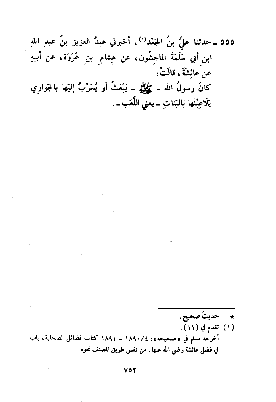 555 - حَدَّثَنَا عَلِيُّ بْنُ الْجَعْدِ، أَخْبَرَنِي عَبْدُ الْعَزِيزِ بْنُ عَبْدِ اللَّهِ بْنِ أَبِي سَلَمَةَ الْمَاجِشُونُ، عَنْ هِشَامِ بْنِ عُرْوَةَ، عَنْ أَبِيهِ، عَنْ عَائِشَةَ، قَالَتْ: كَانَ رَسُولُ اللَّهِ صَلَّى اللهُ عَلَيْهِ وَسَلَّمَ §يَبْعَثُ أَوْ يُسَرِّبُ إِلَيْهَا بِالْجَوَارِي يُلَاعِبْنَهَا بِالْبَنَاتِ - يَعْنِي: اللَّعِبَ -
