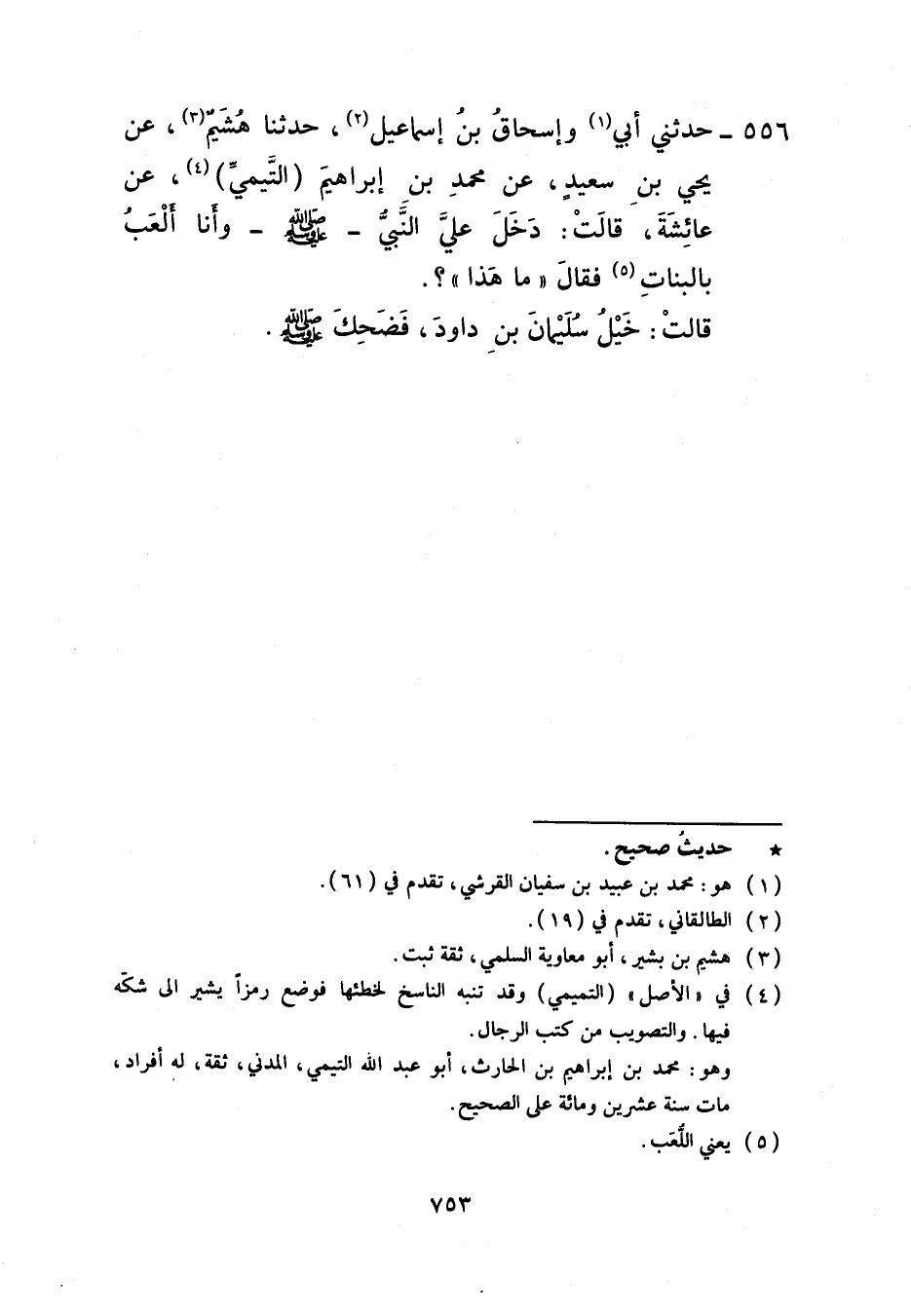 556 - حَدَّثَنِي أَبِي , وَإِسْحَاقُ بْنُ إِسْمَاعِيلَ، حَدَّثَنَا هُشَيْمٌ، عَنْ يَحْيَى بْنِ سَعِيدٍ، عَنْ مُحَمَّدِ بْنِ إِبْرَاهِيمَ التَّيْمِيِّ، عَنْ عَائِشَةَ، قَالَتْ: دَخَلَ عَلَيَّ النَّبِيُّ صَلَّى اللهُ عَلَيْهِ وَسَلَّمَ وَأَنَا أَلْعَبُ، بِالْبَنَاتِ فَقَالَ: «مَا هَذَا؟» قَالَتْ: §خَيْلُ سُلَيْمَانَ بْنِ دَاوُدَ فَضَحِكَ صَلَّى اللهُ عَلَيْهِ وَسَلَّمَ