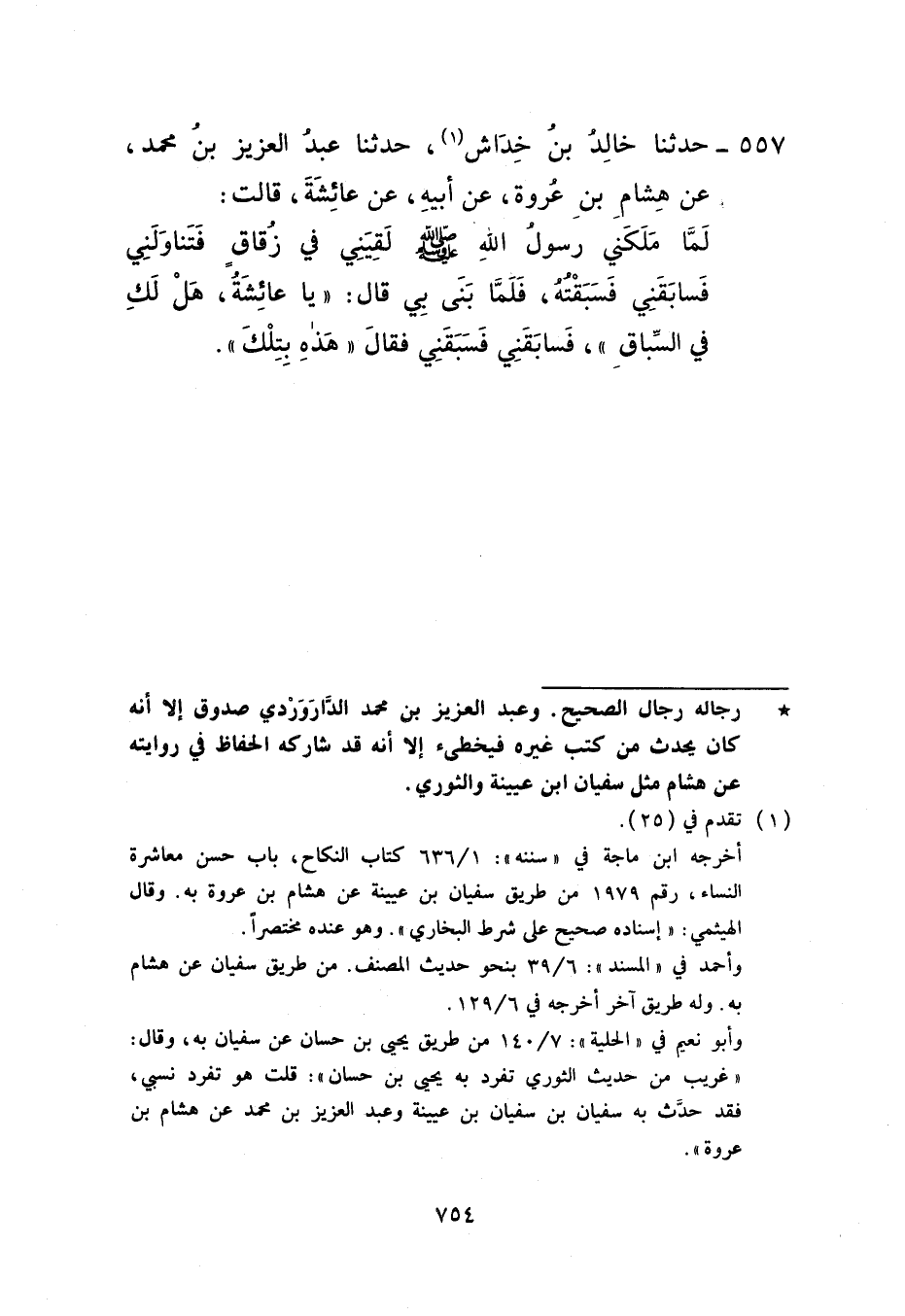 557 - حَدَّثَنَا خَالِدُ بْنُ خِدَاشٍ، حَدَّثَنَا عَبْدُ الْعَزِيزِ بْنُ مُحَمَّدٍ، عَنْ هِشَامِ بْنِ عُرْوَةَ، عَنْ أَبِيهِ، عَنْ عَائِشَةَ، قَالَتْ: لَمَّا مَلَكَنِي رَسُولُ اللَّهِ صَلَّى اللهُ عَلَيْهِ وَسَلَّمَ لَقِيَنِي فِي زُقَاقٍ فَتَنَاوَلَنِي فَسَابَقَنِي فَسَبَقْتُهُ فَلَمَّا بَنَى بِي قَالَ: «يَا عَائِشَةُ §هَلْ لَكِ فِي السِّبَاقِ» فَسَابَقَنِي فَسَبَقَنِي فَقَالَ: «هَذِهِ بِتِلْكَ»