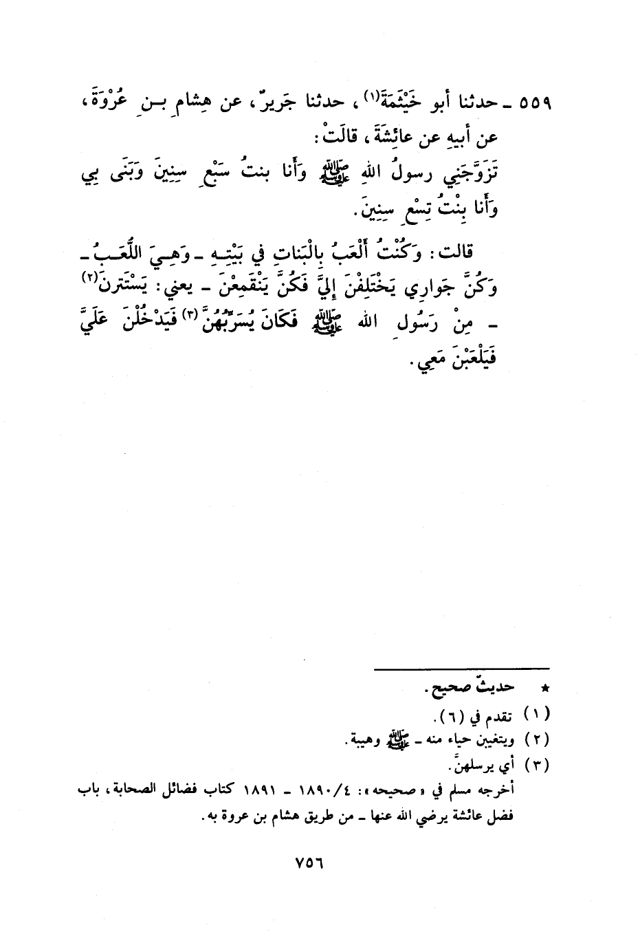 559 - حَدَّثَنَا أَبُو خَيْثَمَةَ، حَدَّثَنَا جَرِيرٌ، عَنْ هِشَامِ بْنِ عُرْوَةَ، عَنْ أَبِيهِ، عَنْ عَائِشَةَ، قَالَتْ: §تَزَوَّجَنِي رَسُولُ اللَّهِ صَلَّى اللهُ عَلَيْهِ وَسَلَّمَ وَأَنَا بِنْتُ سَبْعِ سِنِينَ وَبَنَى بِي وَأَنَا بِنْتُ تِسْعِ سِنِينَ قَالَتْ: وَكُنْتُ أَلْعَبُ بِالْبَنَاتِ فِي بَيْتِهِ وَهِيَ اللُّعَبُ وَكُنَّ جَوَارِيَ يَخْتَلِفْنَ إِلَيَّ فَكُنَّ يَنْقَمِعْنَ - يَعْنِي يَسْتَتِرْنَ - مِنْ رَسُولِ اللَّهِ صَلَّى اللهُ عَلَيْهِ وَسَلَّمَ فَكَانَ يُسَرِّبُهُنَّ فَيَدْخُلْنَ عَلَيَّ فَيَلْعَبْنَ مَعِي