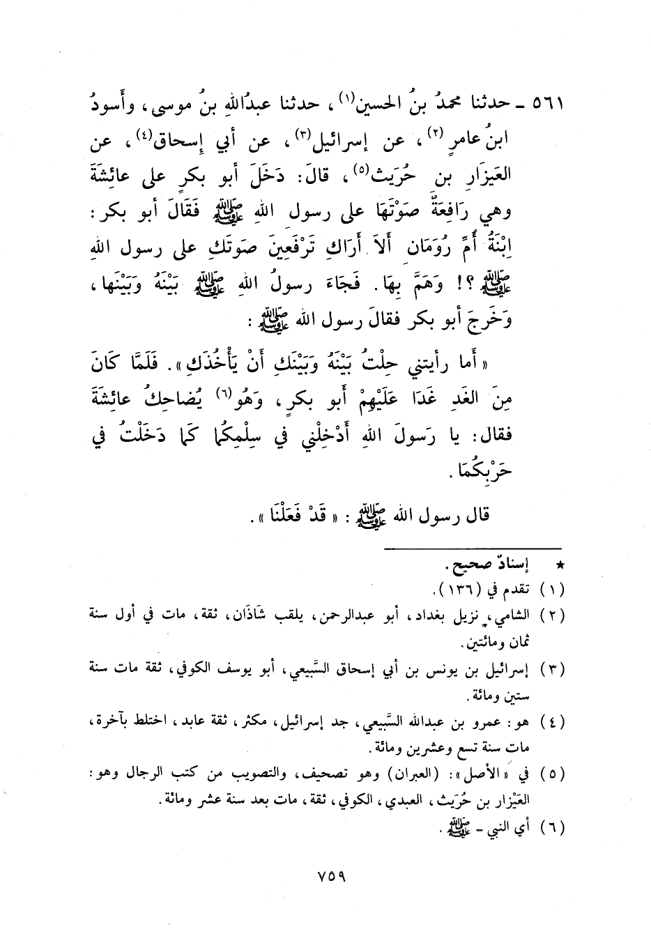 561 - حَدَّثَنَا مُحَمَّدُ بْنُ الْحُسَيْنِ، حَدَّثَنَا عَبْدُ اللَّهِ بْنُ مُوسَى، وَأَسْوَدُ بْنُ عَامِرٍ، عَنْ إِسْرَائِيلَ، عَنْ أَبِي إِسْحَاقَ، عَنِ الْعَيْزَارِ بْنِ حُرَيْثٍ، قَالَ: دَخَلَ أَبُو بَكْرٍ عَلَى عَائِشَةَ وَهِيَ رَافِعَةٌ صَوْتَهَا عَلَى رَسُولِ اللَّهِ صَلَّى اللهُ عَلَيْهِ وَسَلَّمَ فَقَالَ أَبُو بَكْرٍ: ابْنَةَ أُمِّ رُومَانَ، أَلَا أَرَاكِ تَرْفَعِينَ صَوْتَكِ عَلَى رَسُولِ اللَّهِ صَلَّى اللهُ عَلَيْهِ وَسَلَّمَ، وَهَمَّ بِهَا، فَجَاءَ رَسُولُ اللَّهِ صَلَّى اللهُ عَلَيْهِ وَسَلَّمَ بَيْنَهُ وَبَيْنَهَا، وَخَرَجَ أَبُو بَكْرٍ فَقَالَ رَسُولُ اللَّهِ صَلَّى اللهُ عَلَيْهِ وَسَلَّمَ: «§أَمَا رَأَيْتِنِي حُلْتُ بَيْنَهُ وَبَيْنَكِ أَنْ يَأْخُذَكِ؟» فَلَمَّا كَانَ مِنَ الْغَدِ غَدَا عَلَيْهِمْ أَبُو بَكْرٍ وَهُوَ يُضَاحِكَ عَائِشَةَ فَقَالَ: يَا رَسُولَ اللَّهِ، أَدْخِلْنِي فِي سِلْمِكُمَا كَمَا دَخَلْتُ فِي حَرْبِكُمَا، قَالَ رَسُولُ اللَّهِ صَلَّى اللهُ عَلَيْهِ وَسَلَّمَ: «قَدْ فَعَلْنَا»
