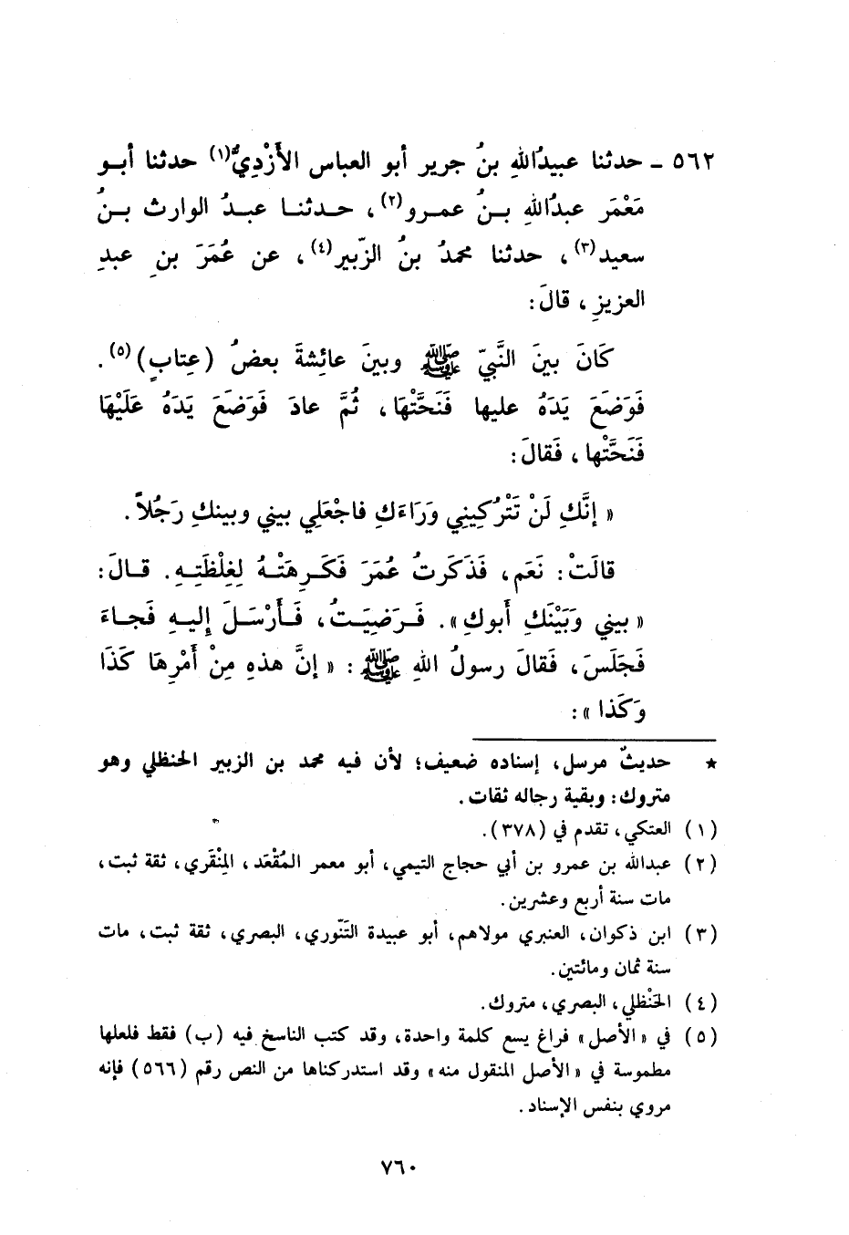 562 - حَدَّثَنَا عُبَيْدُ اللَّهِ بْنُ جَرِيرٍ أَبُو الْعَبَّاسِ الْأَزْدِيُّ، حَدَّثَنَا أَبُو مَعْمَرٍ عَبْدُ اللَّهِ بْنُ عَمْرٍو، حَدَّثَنَا عَبْدُ الْوَارِثِ بْنُ سَعِيدٍ، حَدَّثَنَا مُحَمَّدُ بْنُ الزُّبَيْرِ، عَنْ عُمَرَ بْنِ عَبْدِ الْعَزِيزِ، قَالَ: كَانَ بَيْنَ النَّبِيِّ صَلَّى اللهُ عَلَيْهِ وَسَلَّمَ وَبَيْنَ عَائِشَةَ بَعْضُ عِتَابٍ فَوَضَعَ يَدَهُ عَلَيْهَا فَنَحَّتْهَا ثُمَّ عَادَ فَوَضَعَ يَدَهُ عَلَيْهَا فَنَحَّتْهَا فَقَالَ: «إِنَّكِ لَنْ تَتْرُكِينِي وَرَاءَكِ فَاجْعَلِي بَيْنِي وَبَيْنَكِ رَجُلًا» قَالَتْ: نَعَمْ فَذَكَرْتُ عُمَرَ فَكَرِهْتُهُ لِغِلْظَتِهِ قَالَ: «بَيْنِي وَبَيْنَكِ أَبُوكِ» فَرَضِيتُ فَأَرْسَلَ إِلَيْهِ فَجَاءَ فَجَلَسَ فَقَالَ رَسُولُ اللَّهِ صَلَّى اللهُ عَلَيْهِ وَسَلَّمَ: «إِنَّ هَذِهِ مِنْ أَمْرِهَا كَذَا وَكَذَا» -[761]- قَالَتِ: اتَّقِ اللَّهَ وَلَا تَقُلْ إِلَّا حَقًّا فَرَفَعَ يَدَهُ فَضَرَبَ وَجْهَهَا وَرَغَمَ أَنْفَهَا وَقَالَ: لَا أُمَّ لَكِ أَنْتِ وَأَبُوكِ تَقُولَانِ الْحَقَّ وَرَسُولُ اللَّهِ لَا يَقُولُ الْحَقَّ؟ قَالَ: ثُمَّ قَامَ فَأَخَذَ جَرِيدَةً فَجَعَلَ يَضْرِبُهَا فَقَامَتْ فَجَلَسَتْ خَلْفَ رَسُولِ اللَّهِ صَلَّى اللهُ عَلَيْهِ وَسَلَّمَ فَقَالَ رَسُولُ اللَّهِ صَلَّى اللهُ عَلَيْهِ وَسَلَّمَ: «يَا أَبَا بَكْرٍ إِنَّا لَمْ نُرِدْ ذَلِكَ أَقْسَمْتُ عَلَيْكَ لَمَا خَرَجْتَ عَنَّا» فَخَرَجَ فَلَمَّا خَرَجَ قَامَتْ فَجَلَسَتْ نَاحِيَةً فَدَعَاهَا رَسُولُ اللَّهِ صَلَّى اللهُ عَلَيْهِ وَسَلَّمَ فَأَبَتْ أَنْ تَأْتِيَهُ فَقَالَ رَسُولُ اللَّهِ صَلَّى اللهُ عَلَيْهِ وَسَلَّمَ: «إِنَّكِ §لَشَدِيدَةُ التَّلَزِّقِ بِظَهْرِي قَبْلُ»