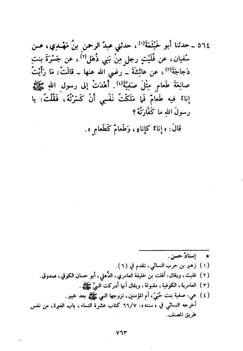 564 - حَدَّثَنَا أَبُو خَيْثَمَةَ، حَدَّثَنِي عَبْدُ الرَّحْمَنِ بْنُ مَهْدِيٍّ، عَنْ سُفْيَانَ، عَنْ فُلَيْتٍ رَجُلٌ مِنْ بَنِي ذُهْلٍ , عَنْ جَسْرَةَ بِنْتِ دَجَاجَةَ، عَنْ عَائِشَةَ، رَضِيَ اللَّهُ عَنْهَا قَالَتْ: مَا رَأَيْتُ صَانِعَةَ طَعَامٍ مِثْلَ صَفِيَّةَ أَهْدَتْ إِلَى رَسُولِ اللَّهِ صَلَّى اللهُ عَلَيْهِ وَسَلَّمَ إِنَاءً فِيهِ طَعَامٌ فَمَا مَلَكْتُ نَفْسِي أَنْ كَسَرْتَهُ فَقُلْتُ: يَا رَسُولَ اللَّهِ، مَا كَفَّارَتُهُ؟ قَالَ: «§إِنَاءٌ كَإِنَاءٍ وَطَعَامٌ كَطَعَامٍ»