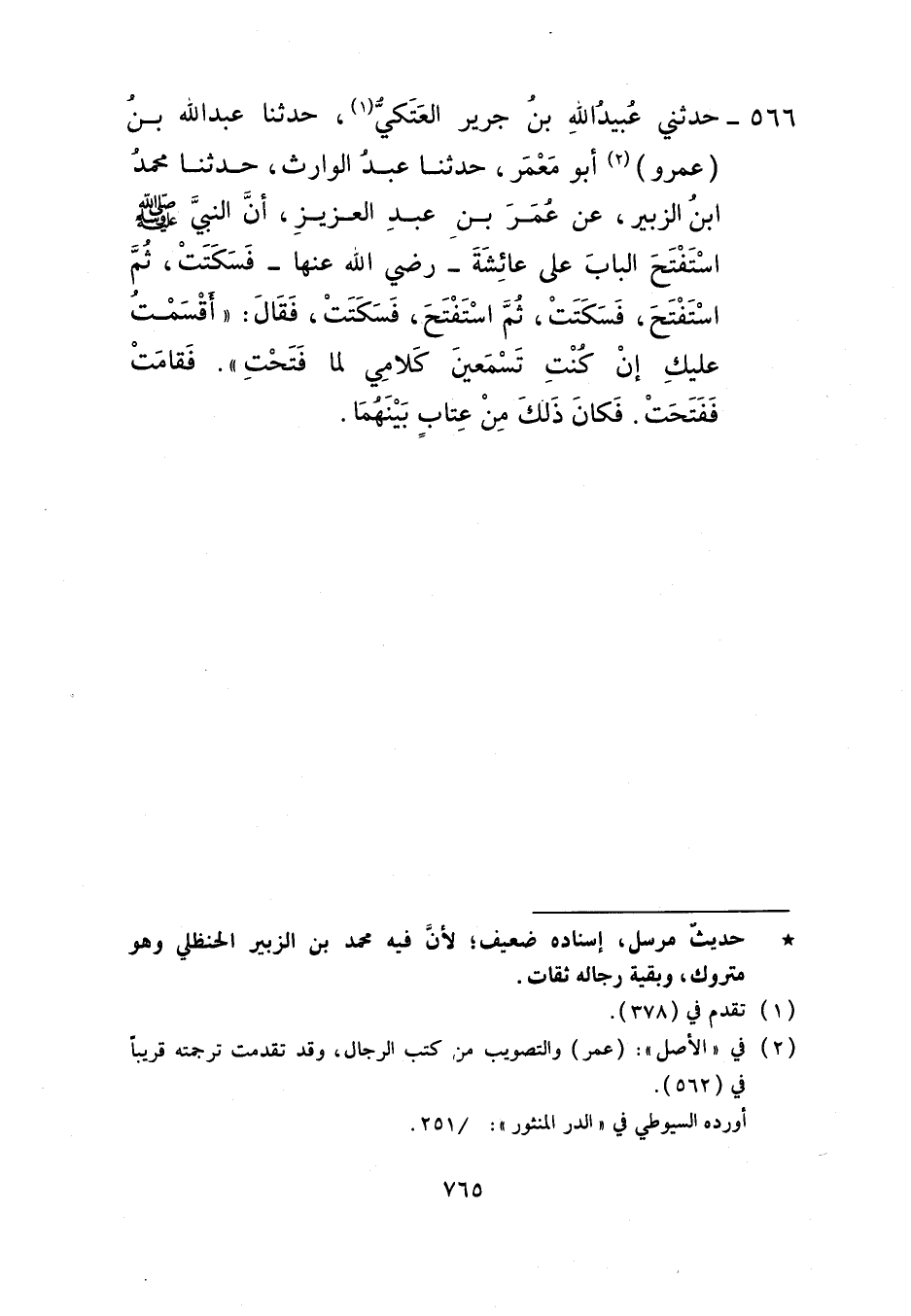 566 - حَدَّثَنِي عُبَيْدُ اللَّهِ بْنُ جَرِيرٍ الْعَتَكِيُّ، حَدَّثَنَا عَبْدُ اللَّهِ بْنُ عَمْرٍو أَبُو مَعْمَرٍ، حَدَّثَنَا عَبْدُ الْوَارِثِ، حَدَّثَنَا مُحَمَّدُ بْنُ الزُّبَيْرِ، عَنْ عُمَرَ بْنِ عَبْدِ الْعَزِيزِ، أَنَّ النَّبِيَّ صَلَّى اللهُ عَلَيْهِ وَسَلَّمَ اسْتَفْتَحَ الْبَابَ عَلَى عَائِشَةَ رَضِيَ اللَّهُ عَنْهَا فَسَكَتَتْ ثُمَّ اسْتَفْتَحَ فَسَكَتَتْ ثُمَّ اسْتَفْتَحَ فَسَكَتَتْ فَقَالَ: «§أَقْسَمْتُ عَلَيْكِ إِنْ كُنْتِ تَسْمَعِينَ كَلَامِي لَمَا فَتَحْتِ» فَقَامَتْ فَفَتَحَتْ فَكَانَ ذَلِكَ مِنْ عِتَابٍ بَيْنَهُمَا
