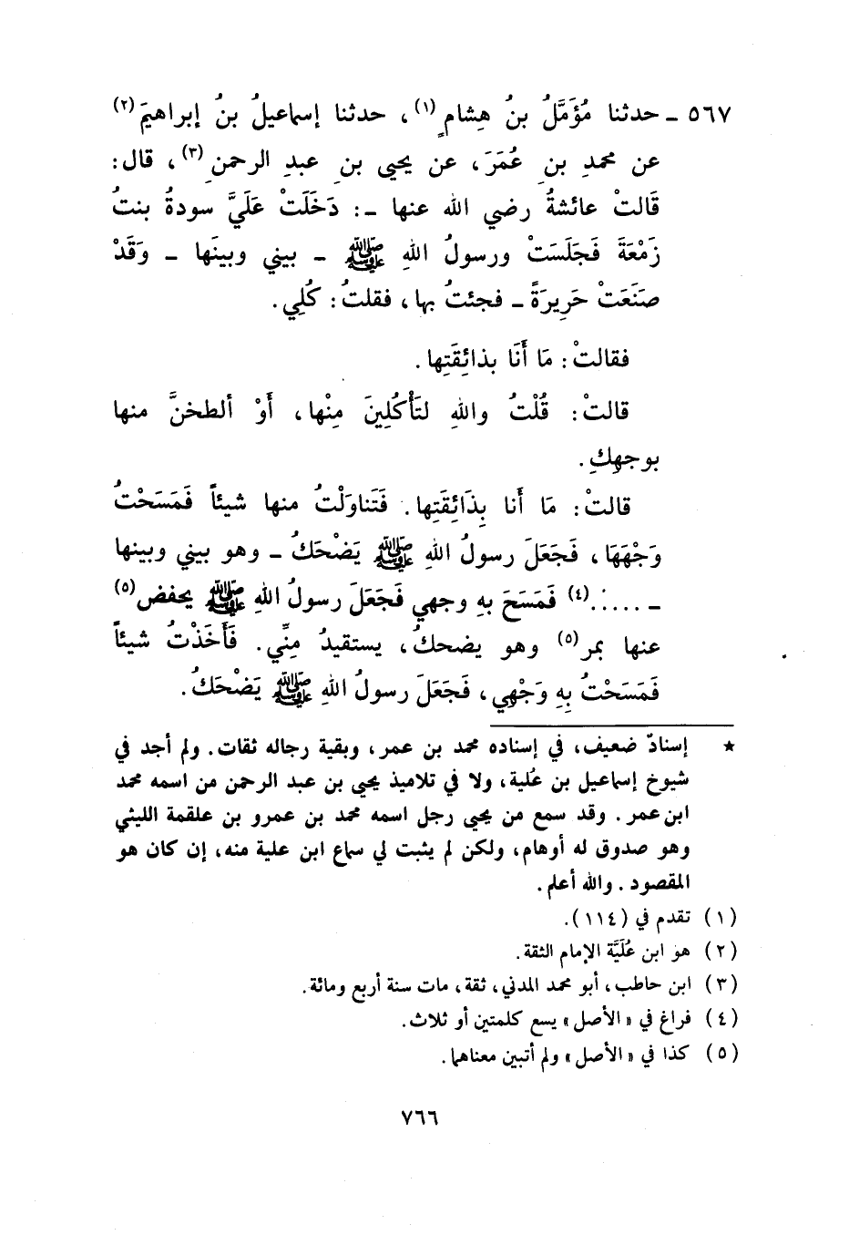 567 - حَدَّثَنَا مُؤَمَّلُ بْنُ هِشَامٍ، حَدَّثَنَا إِسْمَاعِيلُ بْنُ إِبْرَاهِيمَ، عَنْ مُحَمَّدِ بْنِ عُمَرَ، عَنْ يَحْيَى بْنِ عَبْدِ الرَّحْمَنِ، قَالَ: قَالَتْ عَائِشَةُ رَضِيَ اللَّهُ عَنْهَا: دَخَلَتْ عَلَيَّ سَوْدَةُ بِنْتُ زَمْعَةَ فَجَلَسَتْ وَرَسُولُ اللَّهِ صَلَّى اللهُ عَلَيْهِ وَسَلَّمَ بَيْنِي وَبَيْنَهَا وَقَدْ صَنَعْتُ حَرِيرَةً فَجِئْتُ بِهَا فَقُلْتُ: كُلِي فَقَالَتْ: مَا أَنَا بِذَائِقَتِهَا قَالَتْ: قُلْتُ: وَاللَّهِ §لَتَأْكُلِينَ مِنْهَا أَوْ أُلَطِّخَنَّ مِنْهَا بِوَجْهِكِ قَالَتْ: مَا أَنَا بِذَائِقَتِهَا فَتَنَاوَلْتُ مِنْهَا شَيْئًا فَمَسَحَتْ وَجْهَهَا فَجَعَلَ رَسُولُ اللَّهِ صَلَّى اللهُ عَلَيْهِ وَسَلَّمَ يَضْحَكُ وَهُوَ بَيْنِي وَبَيْنَهَا فَمَسَحَ بِهِ وَجْهِي فَجَعَلَ رَسُولُ اللَّهِ صَلَّى اللهُ عَلَيْهِ وَسَلَّمَ يَحْفِضُ عَنْهَا بِمَرٍّ وَهُوَ يَضْحَكُ يَسْتَقِيدُ مِنِّي فَأَخَذَتْ شَيْئًا فَمَسَحَتْ بِهِ وَجْهِي فَجَعَلَ رَسُولُ اللَّهِ صَلَّى اللهُ عَلَيْهِ وَسَلَّمَ يَضْحَكُ