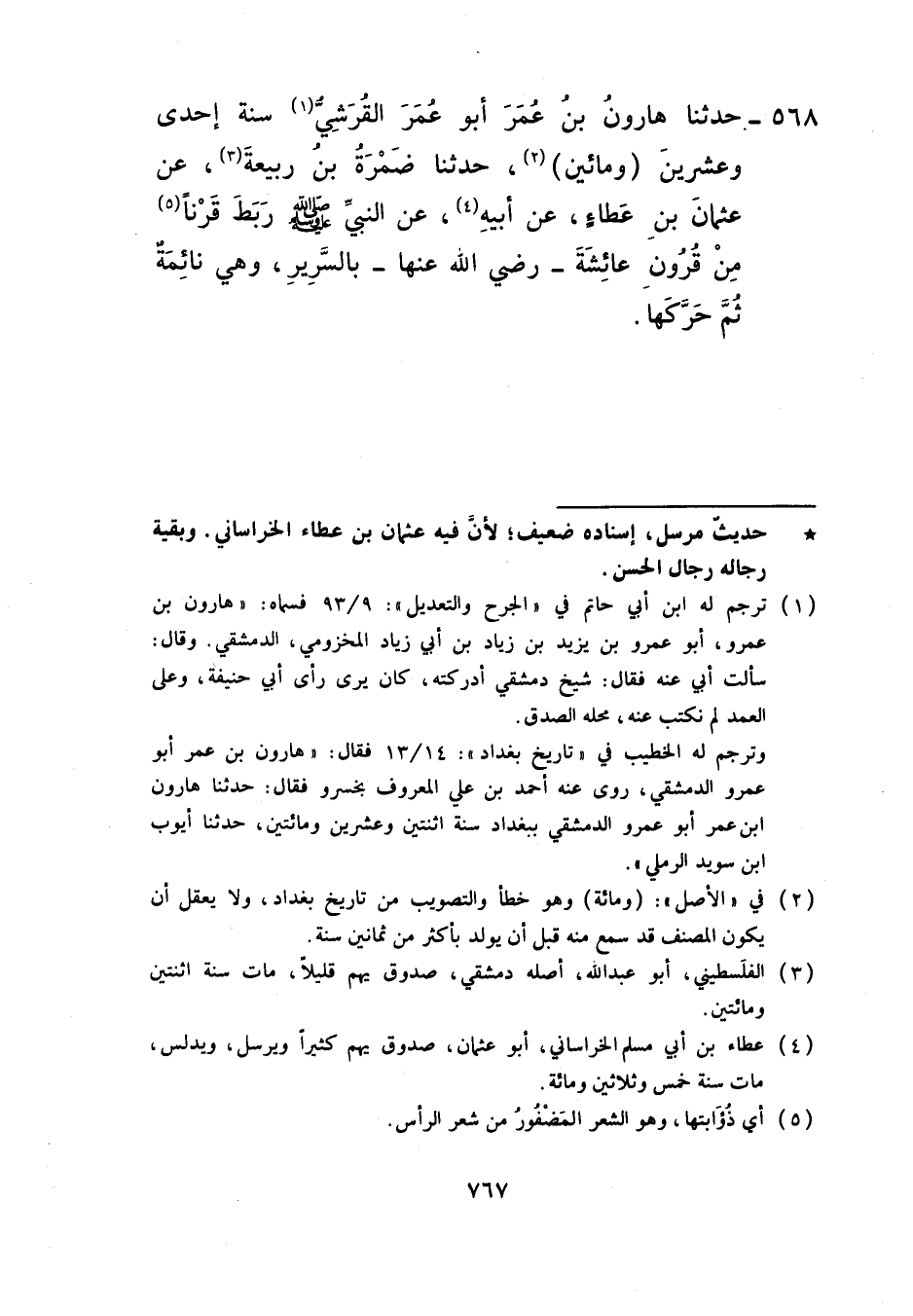 568 - حَدَّثَنَا هَارُونُ بْنُ عُمَرَ أَبُو عُمَرَ الْقُرَشِيُّ، سَنَةَ إِحْدَى وَعِشْرِينَ وَمِائَتَيْنِ، حَدَّثَنَا ضَمْرَةُ بْنُ رَبِيعَةَ، عَنْ عُثْمَانَ بْنِ عَطَاءٍ، عَنْ أَبِيهِ، عَنِ النَّبِيِّ صَلَّى اللهُ عَلَيْهِ وَسَلَّمَ، §رَبَطَ قَرْنًا مِنْ قُرُونِ عَائِشَةَ رَضِيَ اللَّهُ عَنْهَا بِالسَّرِيرِ وَهِيَ نَائِمَةٌ ثُمَّ حَرَّكَهَا