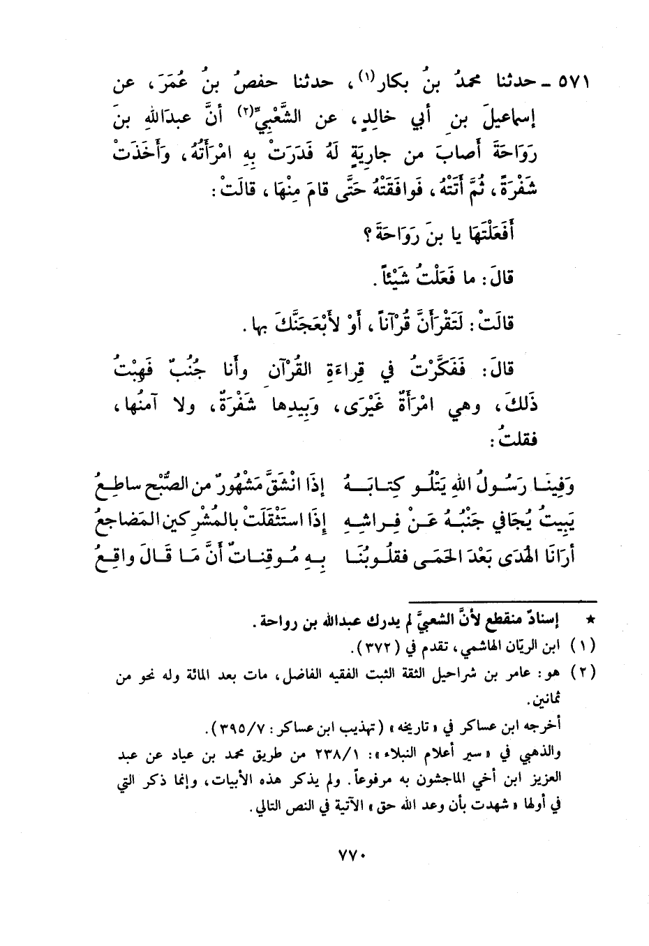 571 - حَدَّثَنَا مُحَمَّدُ بْنُ بَكَّارٍ، حَدَّثَنَا حَفْصُ بْنُ عُمَرَ، عَنْ إِسْمَاعِيلَ بْنِ أَبِي خَالِدٍ، عَنِ الشَّعْبِيِّ، أَنَّ عَبْدَ اللَّهِ بْنَ رَوَاحَةَ أَصَابَ مِنْ جَارِيَةٍ لَهُ فَدَرَتْ بِهِ امْرَأَتُهُ وَأَخَذَتْ شَفْرَةً ثُمَّ أَتَتْهُ فَوَافَقَتْهُ حَتَّى قَامَ مِنْهَا قَالَتْ: أَفَعَلْتَهَا يَا ابْنَ رَوَاحَةَ؟ قَالَ: مَا فَعَلْتُ شَيْئًا قَالَتْ: لَتَقْرَأَنَّ قُرْآنًا أَوْ لَأَبْعُجَنَّكَ بِهَا؟ قَالَ: فَفَكَّرْتُ فِي قِرَاءَةِ الْقُرْآنِ وَأَنَا جُنُبٌ فَهِبْتُ ذَلِكَ وَهِيَ امْرَأَةٌ غَيْرَى وَبِيَدِهَا شَفْرَةٌ وَلَا آمَنُهَا فَقُلْتُ:
