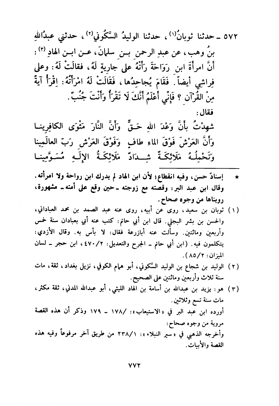 572 - حَدَّثَنَا ثَوْبَانُ، حَدَّثَنَا الْوَلِيدُ السَّكُونِيُّ، حَدَّثَنِي عَبْدُ اللَّهِ بْنُ وَهْبٍ، عَنْ عَبْدِ الرَّحْمَنِ بْنِ سَلْمَانَ، عَنِ ابْنِ الْهَادِ، أَنَّ امْرَأَةَ ابْنِ رَوَاحَةَ، رَأَتْهُ عَلَى جَارِيَةٍ لَهُ فَقَالَتْ لَهُ: وَعَلَى فِرَاشِي أَيْضًا؟ فَقَامَ يُجَاحِدُهَا فَقَالَتْ لَهُ امْرَأَتُهُ: اقْرَأْ آيَةً مِنَ الْقُرْآنِ فَإِنِّي أَعْلَمُ أَنَّكَ لَا تَقْرَأُ وَأَنْتَ جُنُبٌ فَقَالَ: «