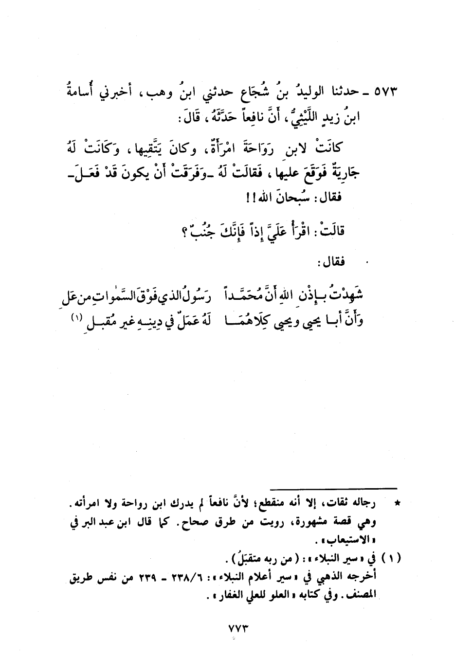 573 - حَدَّثَنَا الْوَلِيدُ بْنُ شُجَاعٍ، حَدَّثَنِي ابْنُ وَهْبٍ، أَخْبَرَنِي أُسَامَةُ بْنُ زَيْدٍ اللَّيْثِيُّ، أَنَّ نَافِعًا حَدَّثَهُ قَالَ: كَانَتْ لِابْنِ رَوَاحَةَ امْرَأَةٌ وَكَانَ يَتَّقِيهَا وَكَانَتْ لَهُ جَارِيَةٌ فَوَقَعَ عَلَيْهَا فَقَالَتْ لَهُ، وَفَرِقَتْ أَنْ يَكُونَ قَدْ فَعَلَ فَقَالَ: سُبْحَانَ اللَّهِ قَالَتِ: اقْرَأْ عَلَيَّ إِذًا فَإِنَّكَ جُنُبٌ فَقَالَ: