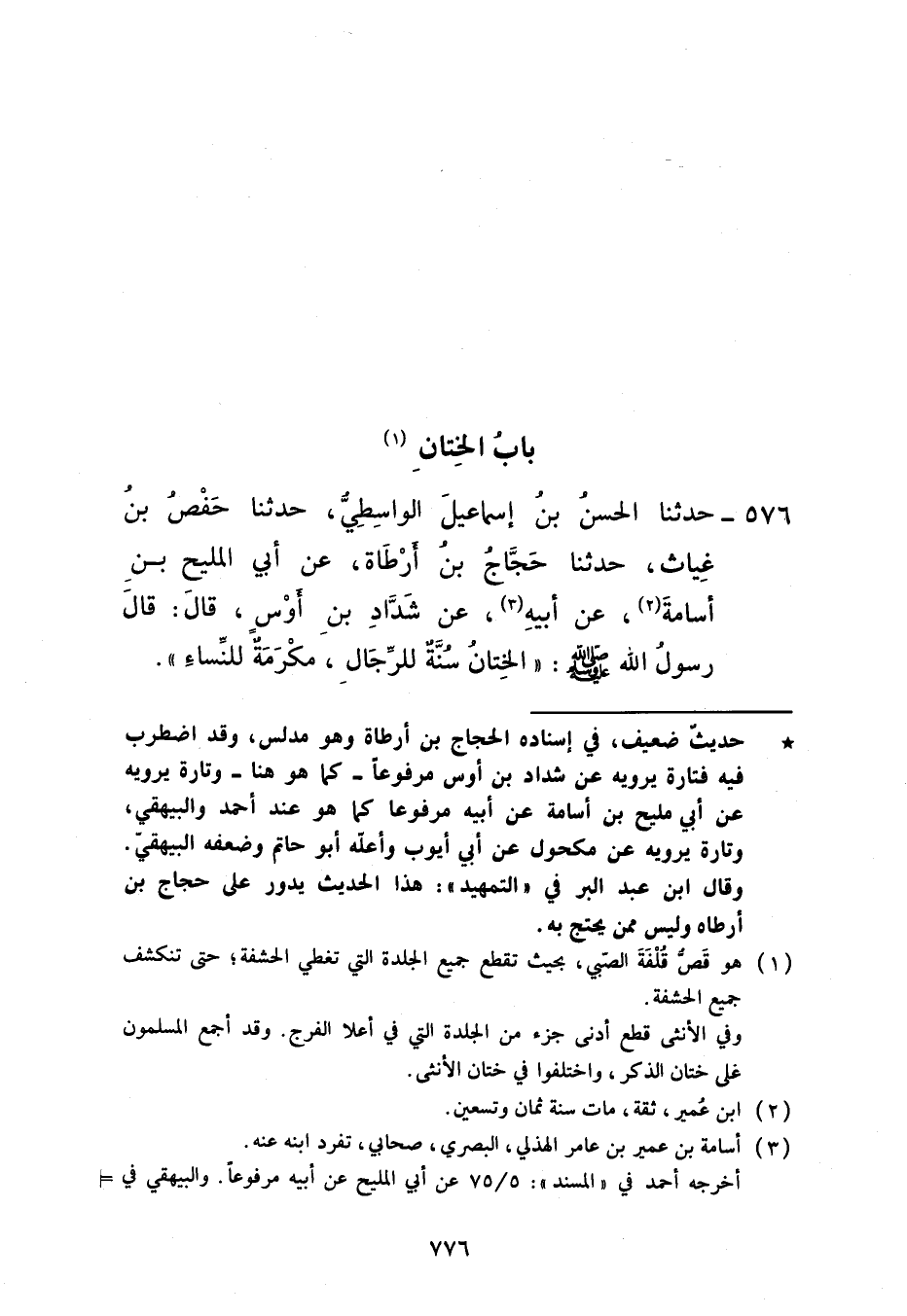 576 - حَدَّثَنَا الْحَسَنُ بْنُ إِسْمَاعِيلَ الْوَاسِطِيُّ، حَدَّثَنَا حَفْصُ بْنُ غِيَاثٍ، حَدَّثَنَا حَجَّاجُ بْنُ أَرْطَأَةَ، عَنْ أَبِي الْمَلِيحِ بْنِ أُسَامَةَ، عَنْ أَبِيهِ، عَنْ شَدَّادِ بْنِ أَوْسٍ، قَالَ: قَالَ رَسُولُ اللَّهِ صَلَّى اللهُ عَلَيْهِ وَسَلَّمَ: «§الْخِتَانِ سُنَّةٌ لِلرِّجَالِ مَكْرُمَةٌ لِلنِّسَاءِ»