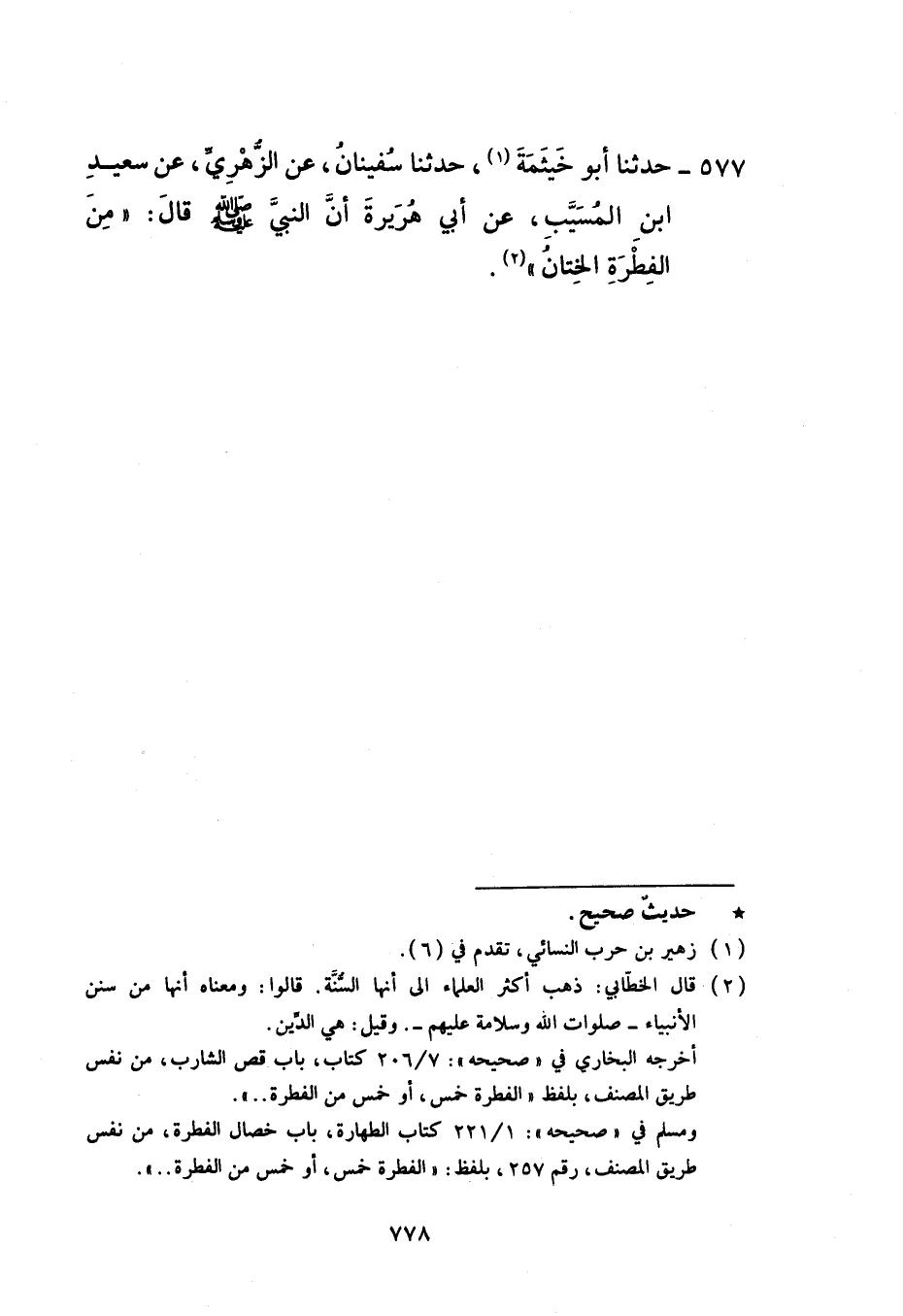 577 - حَدَّثَنَا أَبُو خَيْثَمَةَ، حَدَّثَنَا سُفْيَانُ، عَنِ الزُّهْرِيِّ، عَنْ سَعِيدِ بْنِ الْمُسَيِّبِ، عَنْ أَبِي هُرَيْرَةَ، أَنَّ النَّبِيَّ صَلَّى اللهُ عَلَيْهِ وَسَلَّمَ قَالَ: «§مِنَ الْفِطْرَةِ الْخِتَانُ»
