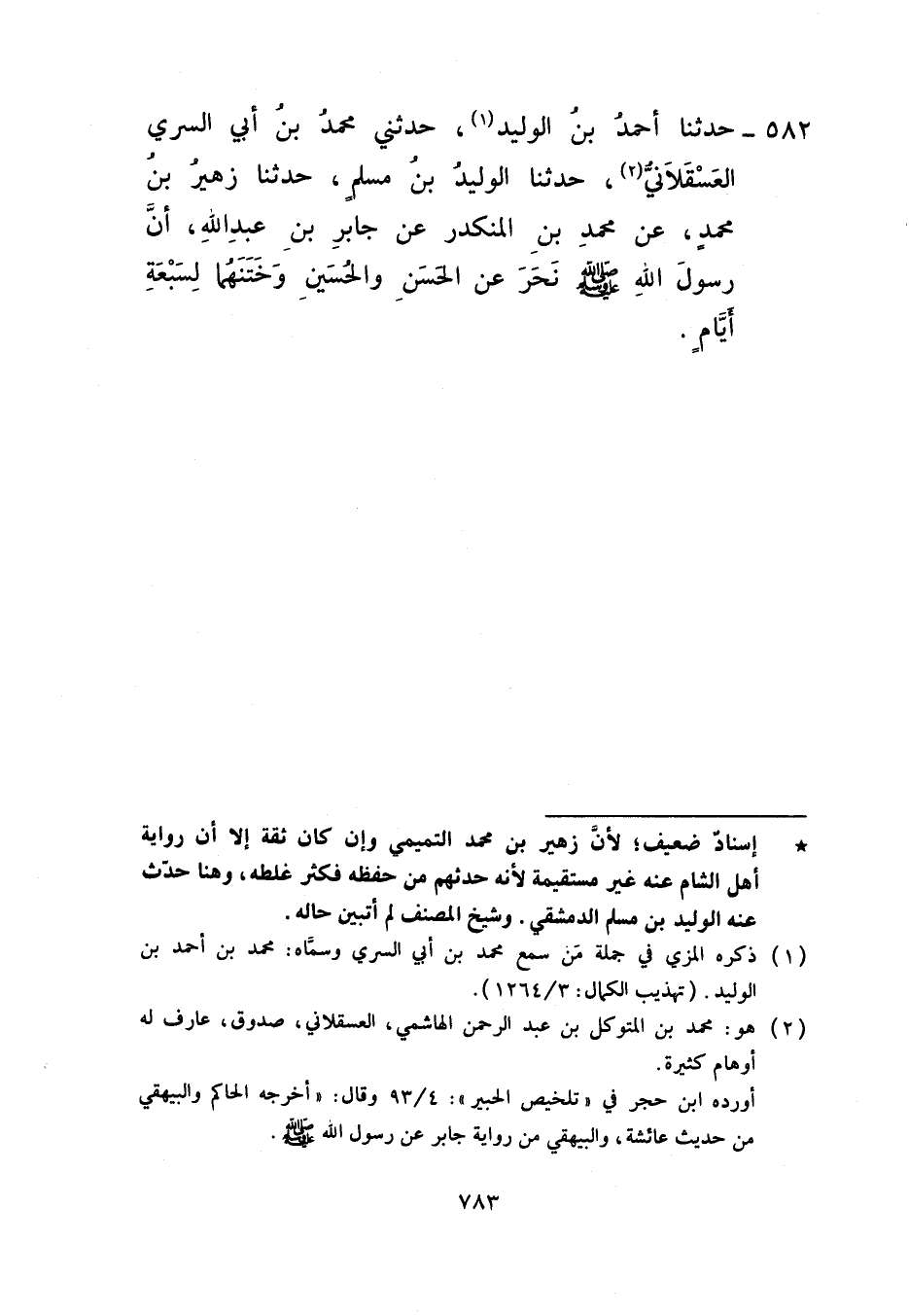 582 - حَدَّثَنَا أَحْمَدُ بْنُ الْوَلِيدِ، حَدَّثَنِي مُحَمَّدُ بْنُ أَبِي السَّرِيِّ الْعَسْقَلَانِيُّ، حَدَّثَنَا الْوَلِيدُ بْنُ مُسْلِمٍ، حَدَّثَنَا زُهَيْرُ بْنُ مُحَمَّدٍ، عَنْ مُحَمَّدِ بْنِ الْمُنْكَدِرِ، عَنْ جَابِرِ بْنِ عَبْدِ اللَّهِ، أَنَّ رَسُولَ اللَّهِ صَلَّى اللهُ عَلَيْهِ وَسَلَّمَ §نَحَرَ عَنِ الْحَسَنِ، وَالْحُسَيْنِ، وَخَتَنَهُمَا لَسَبْعَةِ أَيَّامٍ