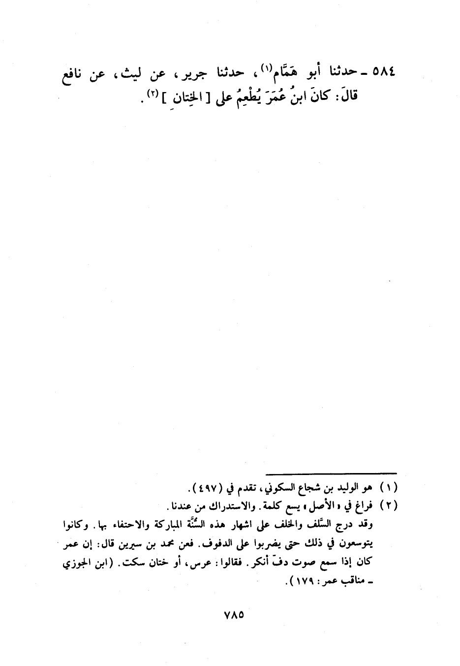 584 - حَدَّثَنَا أَبُو هَمَّامٍ، حَدَّثَنَا جَرِيرٌ، عَنْ لَيْثٍ، عَنْ نَافِعٍ، قَالَ: كَانَ ابْنُ عُمَرَ §يُطْعِمُ عَلَى الْخِتَانِ.