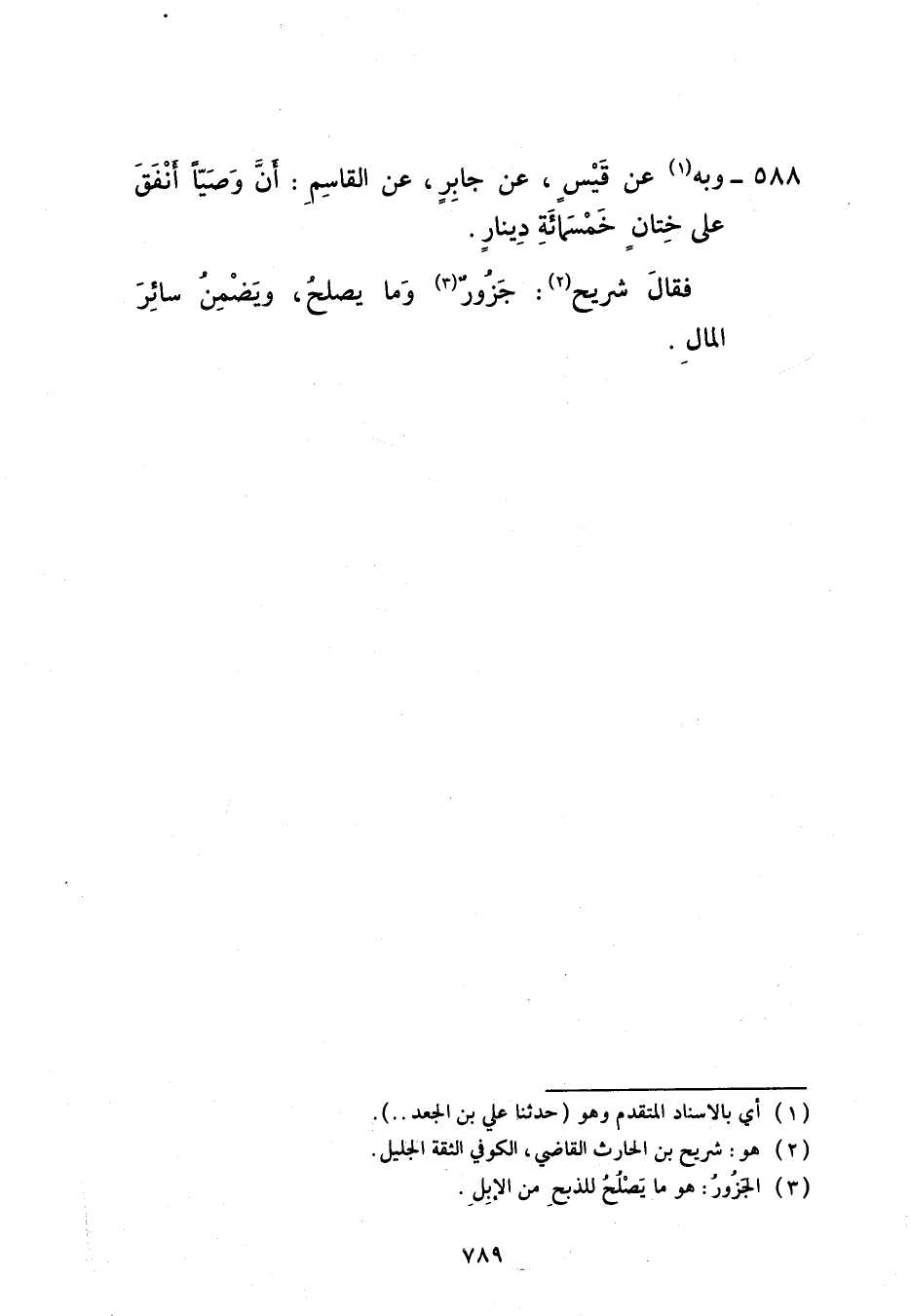 588 - وَبِهِ عَنْ قَيْسٍ، عَنْ جَابِرٍ، عَنِ الْقَاسِمِ، أَنَّ وَصِيًّا أَنْفَقَ عَلَى خِتَانٍ خَمْسِمِائَةِ دِينَارٍ فَقَالَ شُرَيْحٌ: «§جَزُورٌ وَمَا يَصْلُحُ، وَيَضْمَنُ سَائِرَ الْمَالِ»