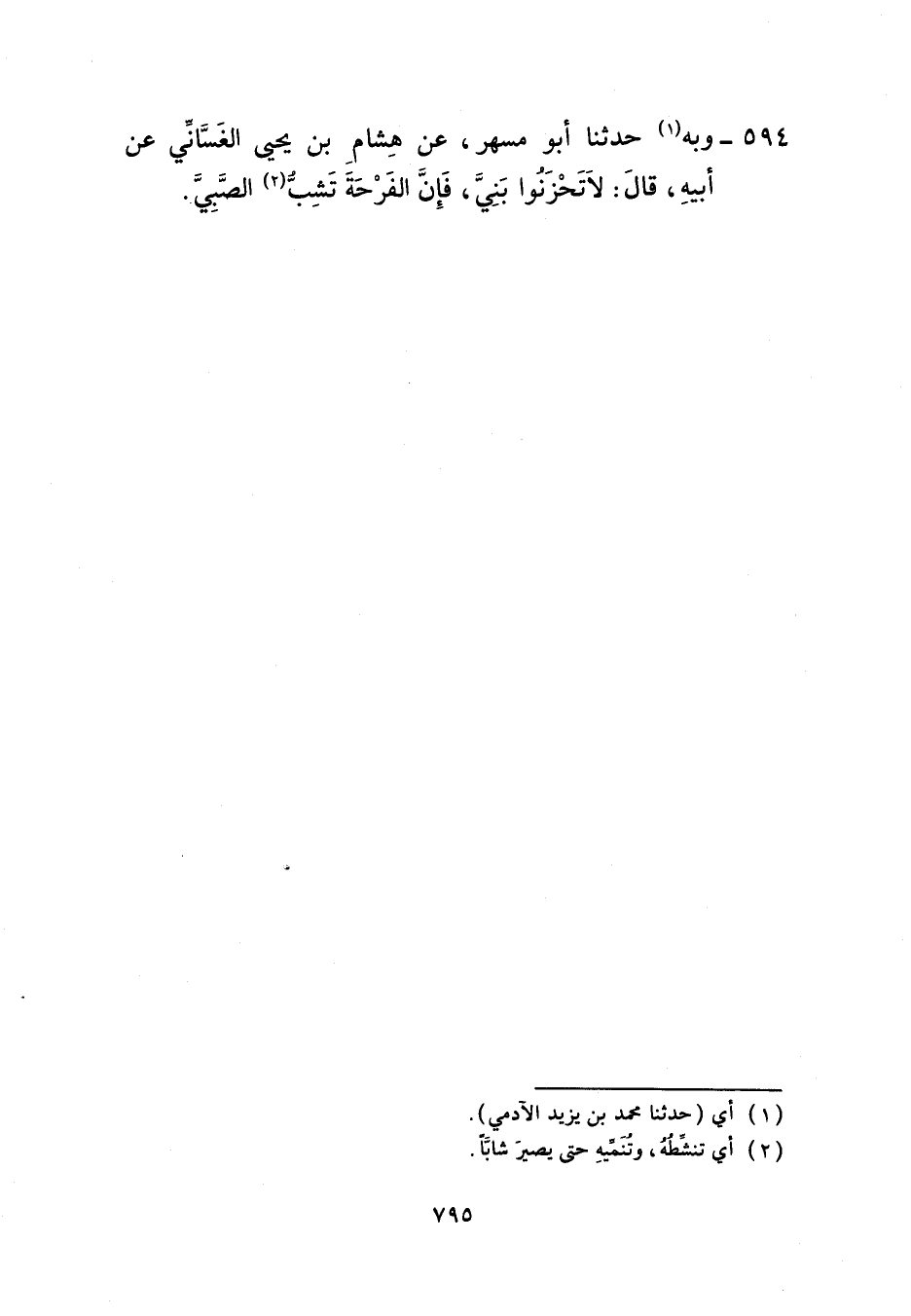 594 - وَبِهِ حَدَّثَنَا أَبُو مُسْهِرٍ، عَنْ هِشَامِ بْنِ يَحْيَى الْغَسَّانِيِّ، عَنْ أَبِيهِ، قَالَ: «لَا تَحْزَنُوا بَنِيَّ فَإِنَّ §الْفَرْحَةَ تَشِبُّ الصَّبِيَّ»