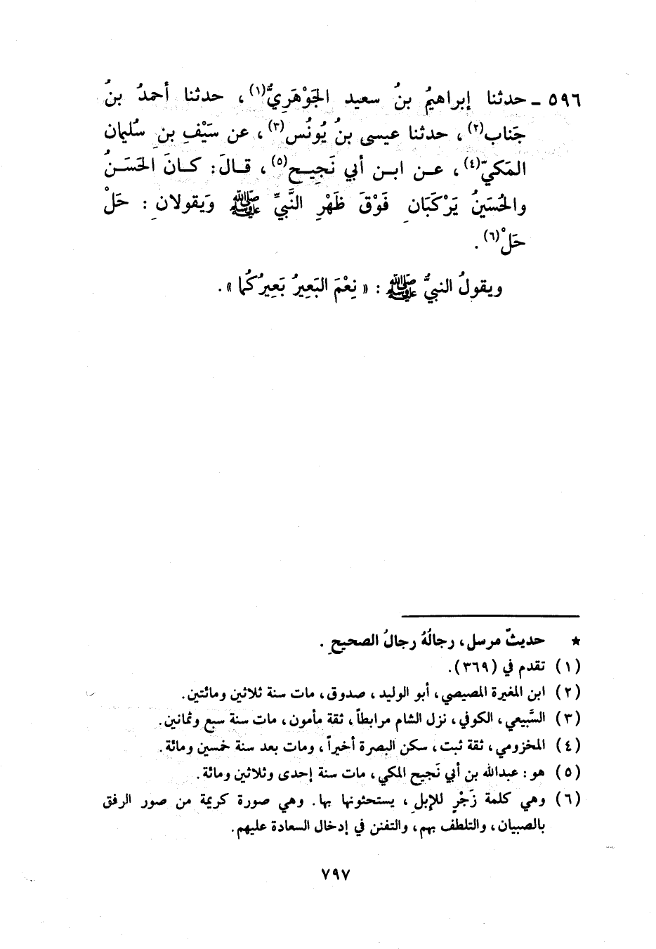 596 - حَدَّثَنَا إِبْرَاهِيمُ بْنُ سَعِيدٍ الْجَوْهَرِيُّ، حَدَّثَنَا أَحْمَدُ بْنُ جَنَابٍ، حَدَّثَنَا عِيسَى بْنُ يُونُسَ، عَنْ سَيْفِ بْنِ سُلَيْمَانَ الْمَكِّيِّ، عَنِ ابْنِ أَبِي نَجِيحٍ، قَالَ: كَانَ الْحَسَنُ وَالْحُسَيْنُ يَرْكَبَانِ فَوْقَ ظَهْرِ النَّبِيِّ صَلَّى اللهُ عَلَيْهِ وَسَلَّمَ وَيَقُولَانِ: حَلْ حَلْ وَيَقُولُ النَّبِيُّ صَلَّى اللهُ عَلَيْهِ وَسَلَّمَ: «§نِعْمَ الْبَعِيرُ بَعُيرُكُمَا»
