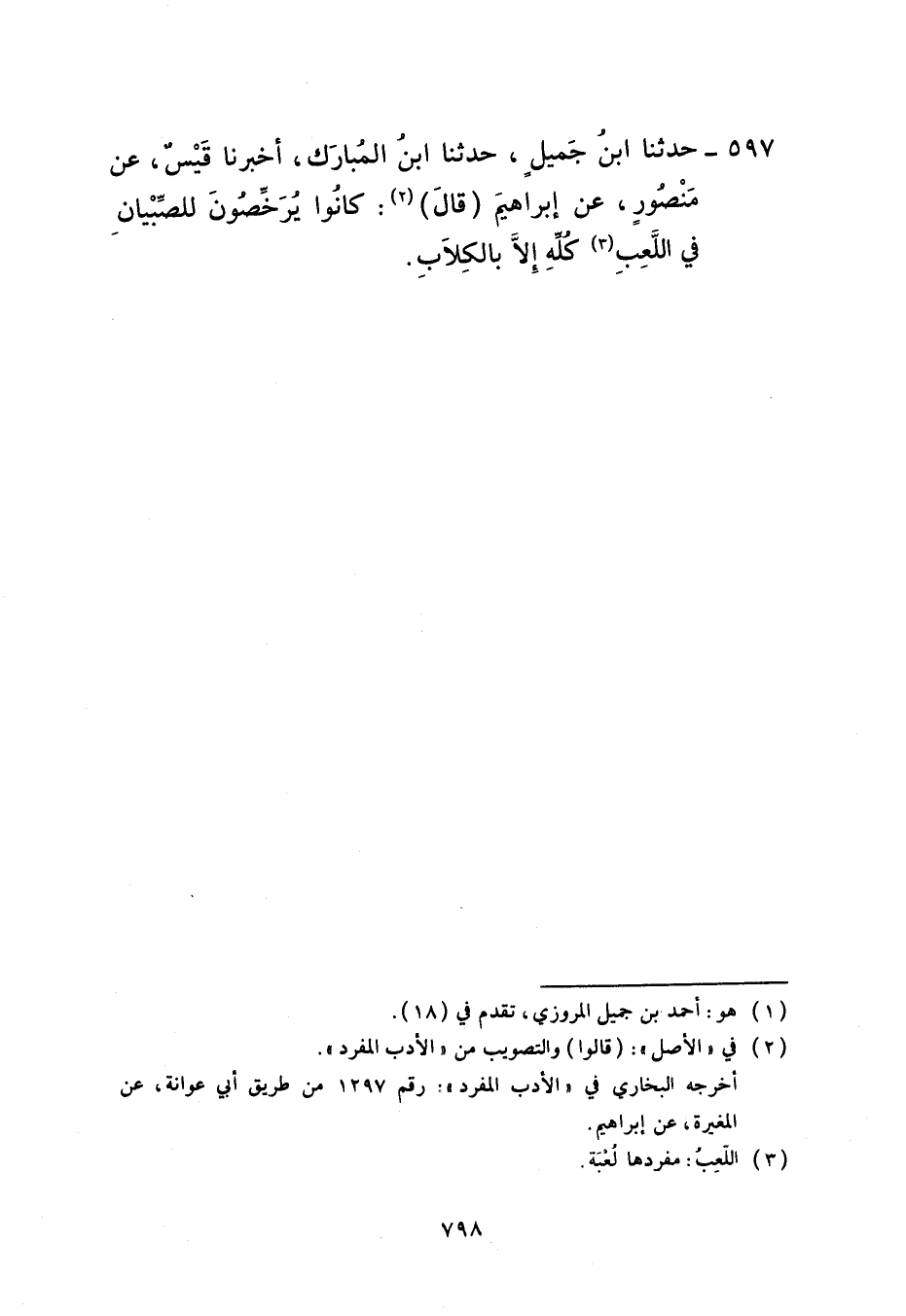 597 - حَدَّثَنَا ابْنُ جَمِيلٍ، حَدَّثَنَا ابْنُ الْمُبَارَكِ، أَخْبَرَنَا قَيْسٌ، عَنْ مَنْصُورٍ، عَنْ إِبْرَاهِيمَ، قَالَ: «كَانُوا §يُرَخِّصُونَ لِلصِّبْيَانِ فِي اللَّعِبِ كُلِّهِ إِلَّا بِالْكِلَابِ»