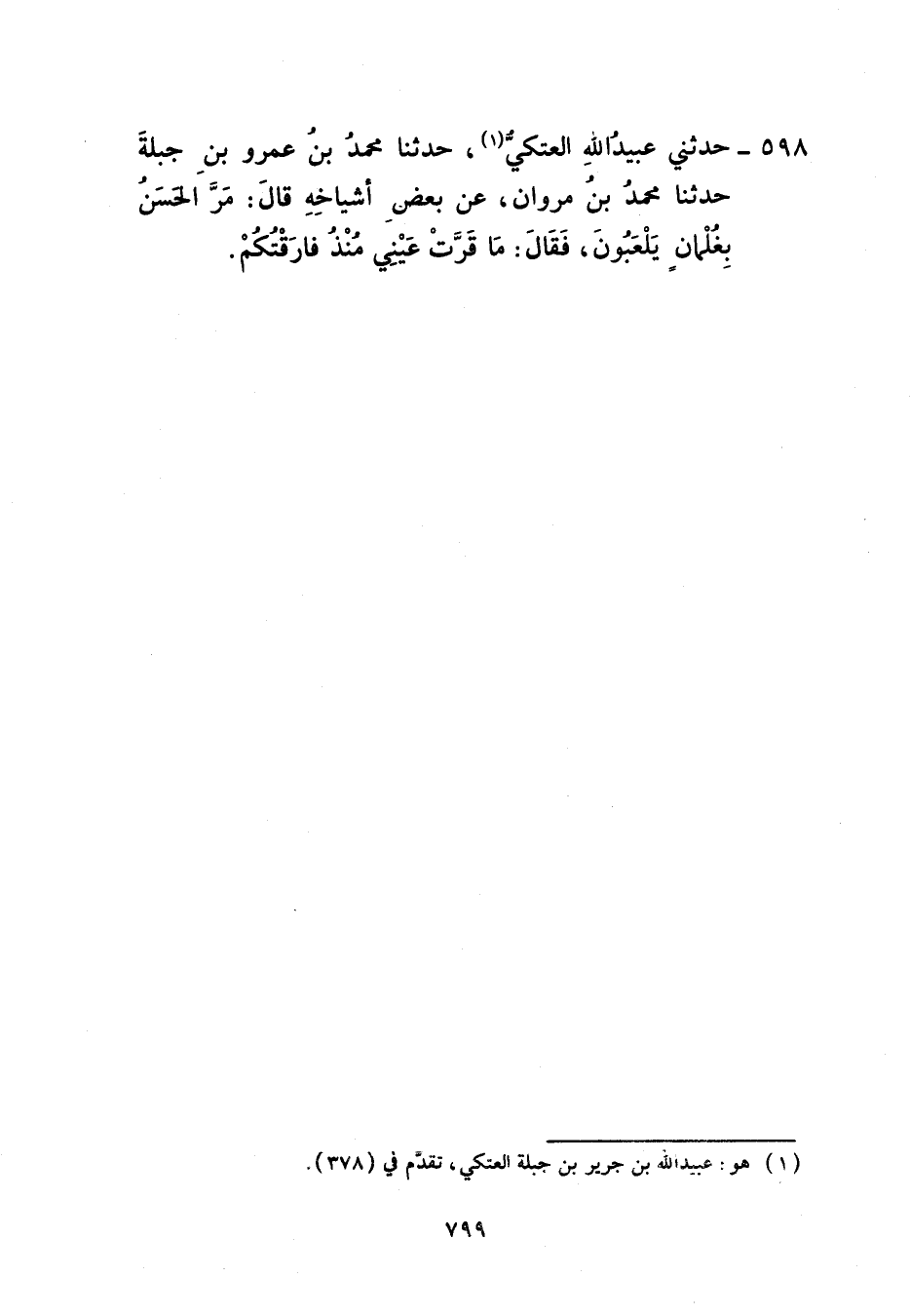 598 - حَدَّثَنِي عُبَيْدُ اللَّهِ الْعَتَكِيُّ، حَدَّثَنَا مُحَمَّدُ بْنُ عَمْرِو بْنِ جَبَلَةَ، حَدَّثَنَا مُحَمَّدُ بْنُ مَرْوَانَ، عَنْ بَعْضِ أَشْيَاخِهِ قَالَ: مَرَّ الْحَسَنُ بِغِلْمَانٍ يَلْعَبُونَ فَقَالَ: §مَا قَرَّتْ عَيْنِي مُنْذُ فَارَقْتُكُمْ