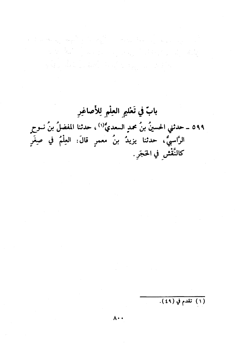 599 - حَدَّثَنِي الْحُسَيْنُ بْنُ مُحَمَّدٍ السَّعْدِيُّ، حَدَّثَنَا الْمُفَضَّلُ بْنُ نُوحٍ الرَّاسِبِيُّ، حَدَّثَنَا يَزِيدُ بْنُ مَعْمَرٍ، قَالَ: §الْعِلْمُ فِي صِغَرٍ كَالنَّقْشِ فِي الْحَجَرِ