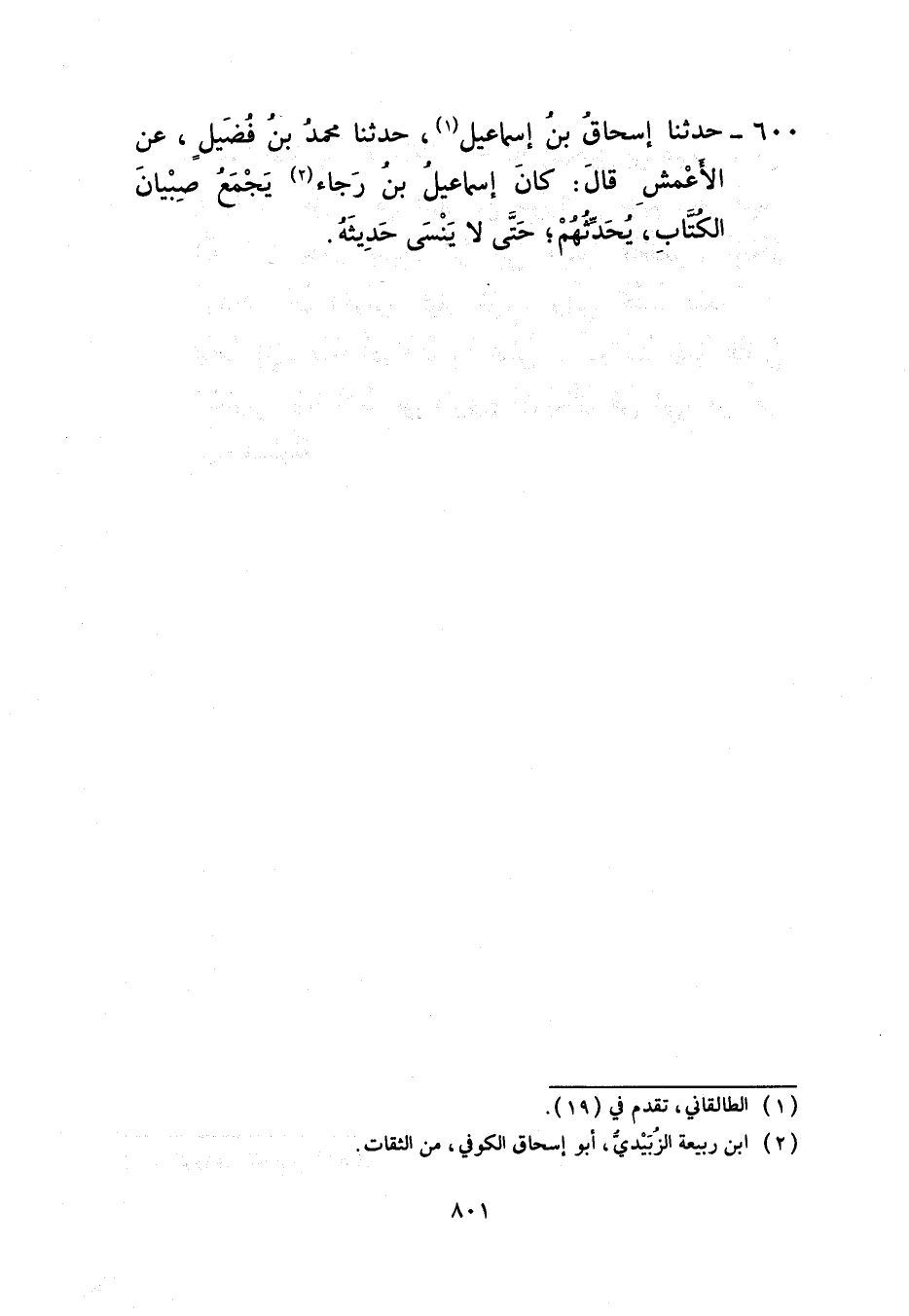 600 - حَدَّثَنَا إِسْحَاقُ بْنُ إِسْمَاعِيلَ، حَدَّثَنَا مُحَمَّدُ بْنُ فُضَيْلٍ، عَنِ الْأَعْمَشِ، قَالَ: «كَانَ إِسْمَاعِيلُ بْنُ رَجَاءٍ §يَجْمَعُ صِبْيَانَ الْكُتَّابِ يُحَدِّثُهُمْ حَتَّى لَا يَنْسَى حَدِيثَهُ»