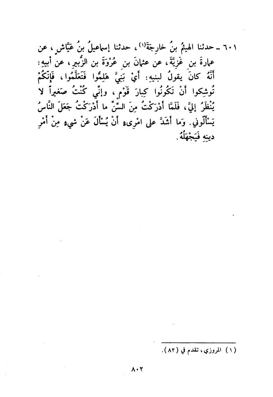 601 - حَدَّثَنَا الْهَيْثَمُ بْنُ خَارِجَةَ، حَدَّثَنَا إِسْمَاعِيلُ بْنُ عَيَّاشٍ، عَنْ عُمَارَةَ بْنِ غَزِيَّةَ، عَنْ عُثْمَانَ بْنِ عُرْوَةَ بْنِ الزُّبَيْرِ، عَنْ أَبِيهِ، أَنَّهُ كَانَ يَقُولُ لِبَنِيهِ: أَيْ بَنِيَّ هَلُمُّوا §فَتَعَلَّمُوا فَإِنَّكُمْ تُوشِكُوا أَنْ تَكُونُوا كِبَارَ قَوْمٍ وَإِنِّي كُنْتُ صَغِيرًا لَا يُنْظَرُ إِلَيَّ فَلَمَّا أَدْرَكْتُ مِنَ السِّنِّ مَا أَدْرَكْتُ جَعَلَ النَّاسُ يَسْأَلُونِي وَمَا أَشَدَّ عَلَى امْرِئٍ أَنْ يُسْأَلَ عَنْ شَيْءٍ مِنْ أَمْرِ دِينِهِ فَيَجْهَلَهُ