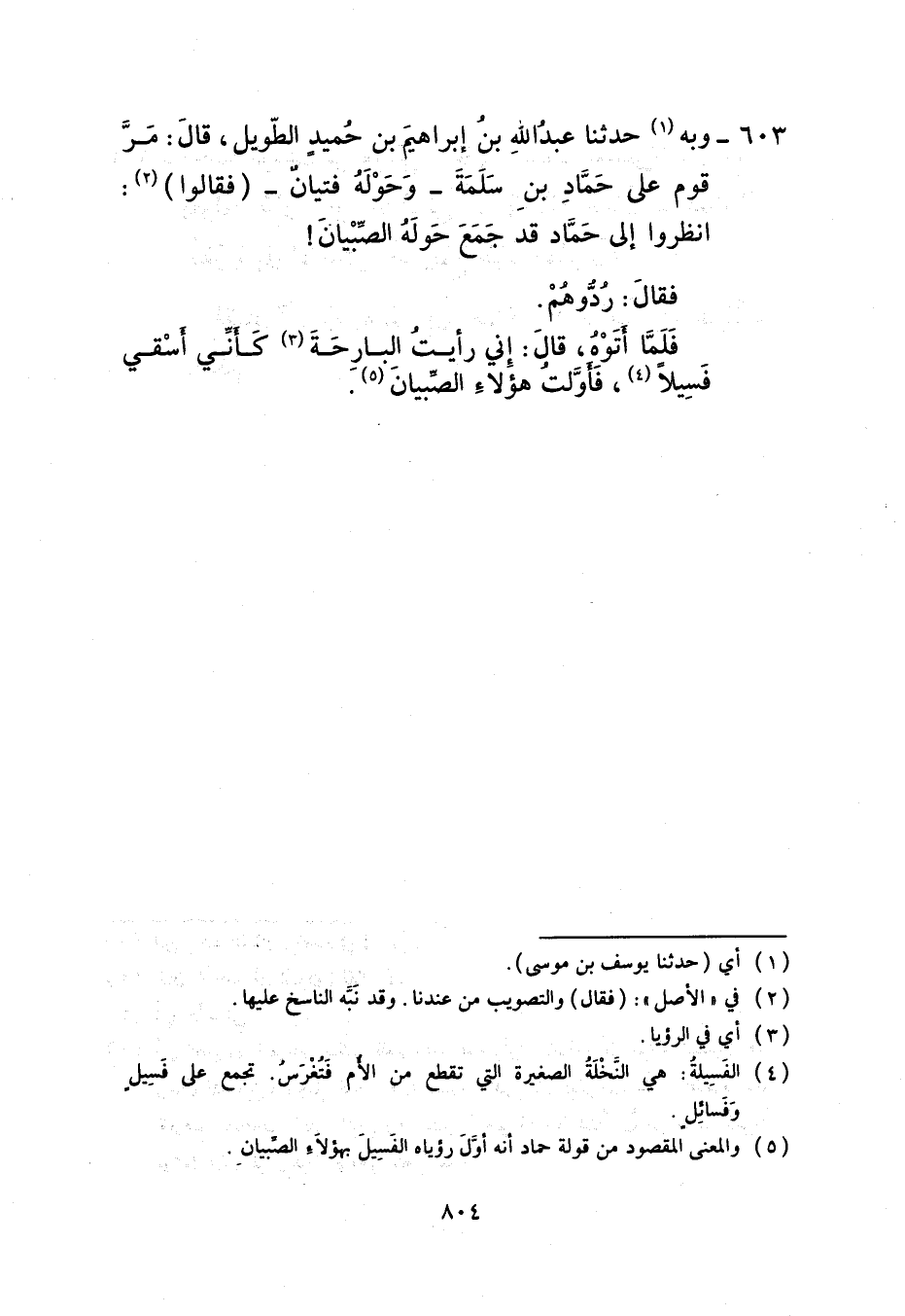 603 - وَبِهِ حَدَّثَنَا عَبْدُ اللَّهِ بْنُ إِبْرَاهِيمَ بْنِ حُمَيْدٍ الطَّوِيلُ، قَالَ: مَرَّ قَوْمٌ عَلَى حَمَّادِ بْنِ سَلَمَةَ وَحَوْلَهُ فَتَيَانٌ فَقَالُوا: انْظُرُوا إِلَى حَمَّادٍ قَدْ جَمَعَ حَوْلَهُ الصِّبْيَانُ فَقَالَ: رُدُّوهُمْ فَلَمَّا أَتَوْهُ قَالَ: إِنِّي «§رَأَيْتُ الْبَارِحَةَ كَأَنِّي أَسْقِي فَسِيلًا فَأَوَّلْتُ هَؤُلَاءِ الصِّبْيَانَ»