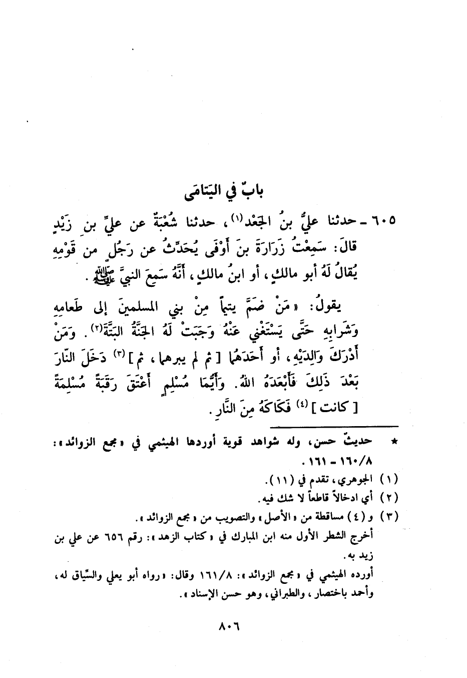 605 - حَدَّثَنَا عَلِيُّ بْنُ الْجَعْدِ، حَدَّثَنَا شُعْبَةُ، عَنْ عَلِيِّ بْنِ زَيْدٍ، قَالَ: سَمِعْتُ زُرَارَةَ بْنَ أَوْفَى، يُحَدِّثُ عَنْ رَجُلٍ مِنْ قَوْمِهِ يُقَالُ لَهُ أَبُو مَالِكٍ أَوِ ابْنُ مَالِكٍ أَنَّهُ سَمِعَ النَّبِيَّ صَلَّى اللهُ عَلَيْهِ وَسَلَّمَ يَقُولُ: «§مَنْ ضَمَّ يَتِيمًا مِنْ بَنِي الْمُسْلِمِينَ إِلَى طَعَامِهِ وَشَرَابِهِ حَتَّى يَسْتَغْنِيَ عَنْهُ وَجَبَتْ لَهُ الْجَنَّةُ الْبَتَّةَ وَمَنْ أَدْرَكَ وَالِدَيْهِ أَوْ أَحَدَهُمَا ثُمَّ لَمْ يَبَرَّهُمَا ثُمَّ دَخَلَ النَّارَ بَعْدَ ذَلِكَ فَأَبْعَدَهُ اللَّهُ وَأَيُّمَا مُسْلِمٍ أَعْتَقَ رَقَبَةً مَسْلَمَةً كَانَتْ فِكَاكَهُ مِنَ النَّارِ»