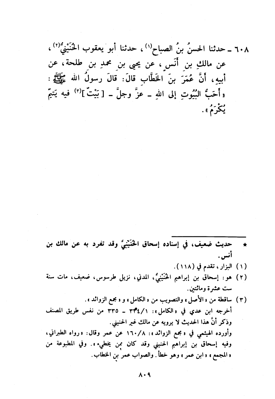 608 - حَدَّثَنَا الْحَسَنُ بْنُ الصَّبَّاحِ، حَدَّثَنَا أَبُو يَعْقُوبَ الْحُنَيْنِيُّ، عَنْ مَالِكِ بْنِ أَنَسٍ، عَنْ يَحْيَى بْنِ مُحَمَّدِ بْنِ طَلْحَةَ، عَنْ أَبِيهِ، أَنَّ عُمَرَ بْنَ الْخَطَّابِ قَالَ: قَالَ رَسُولُ اللَّهِ صَلَّى اللهُ عَلَيْهِ وَسَلَّمَ: «§أَحَبُّ الْبُيُوتِ إِلَى اللَّهِ عَزَّ وَجَلَّ بَيْتٌ فِيهِ يَتِيمٌ يُكْرَمُ»