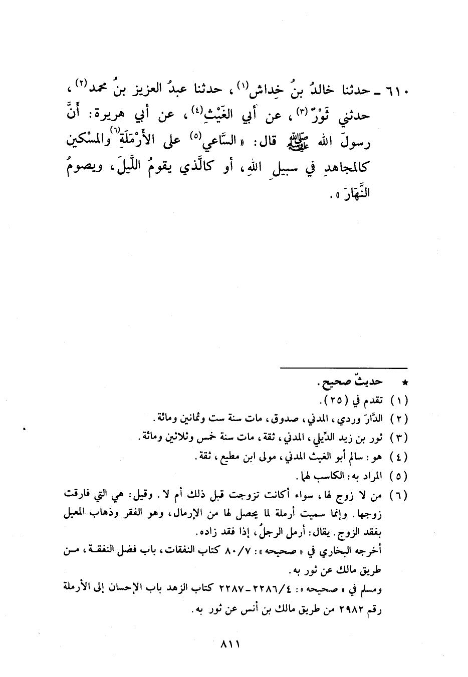 610 - حَدَّثَنَا خَالِدُ بْنُ خِدَاشٍ، حَدَّثَنَا عَبْدُ الْعَزِيزِ بْنُ مُحَمَّدٍ، حَدَّثَنِي ثَوْرٌ، عَنْ أَبِي الْغَيْثِ، عَنْ أَبِي هُرَيْرَةَ، أَنَّ رَسُولَ اللَّهِ صَلَّى اللهُ عَلَيْهِ وَسَلَّمَ قَالَ: «§السَّاعِي عَلَى الْأَرْمَلَةِ وَالْمِسْكِينِ كَالْمُجَاهِدِ فِي سَبِيلِ اللَّهِ أَوْ كَالَّذِي يَقُومُ اللَّيْلَ وَيَصُومُ النَّهَارَ»