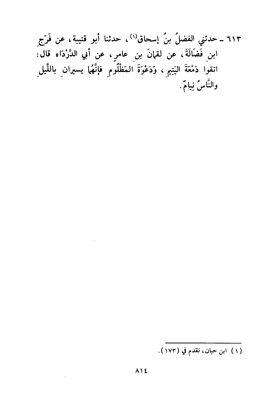 613 - حَدَّثَنِي الْفَضْلُ بْنُ إِسْحَاقَ، حَدَّثَنَا أَبُو قُتَيْبَةَ، عَنْ فَرَجِ بْنِ فَضَالَةَ، عَنْ لُقْمَانَ بْنِ عَامِرٍ، عَنْ أَبِي الدَّرْدَاءِ، قَالَ: §اتَّقُوا دَمْعَهُ الْيَتِيمِ وَدَعْوَةَ الْمَظْلُومِ فَإِنَّهُمَا يَسِيرَانِ بِاللَّيْلِ وَالنَّاسُ نِيَامٌ