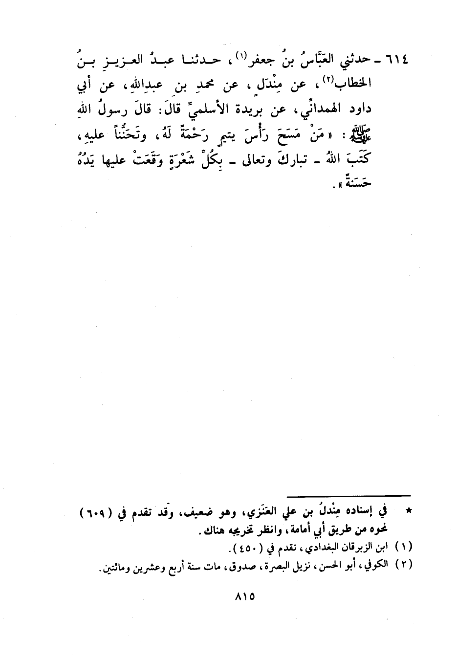 614 - حَدَّثَنِي الْعَبَّاسُ بْنُ جَعْفَرٍ، حَدَّثَنَا عَبْدُ الْعَزِيزِ بْنُ الْخَطَّابِ، عَنْ مِنْدَلٍ، عَنْ مُحَمَّدِ بْنِ عَبْدِ اللَّهِ، عَنْ أَبِي دَاوُدَ الْهَمْدَانِيِّ، عَنْ بُرَيْدَةَ الْأَسْلَمِيِّ، قَالَ: قَالَ رَسُولُ اللَّهِ صَلَّى اللهُ عَلَيْهِ وَسَلَّمَ: «§مَنْ مَسَحَ رَأْسَ يَتِيمٍ رَحْمَةً لَهُ وَتَحَنُّنًا عَلَيْهِ كَتَبَ اللَّهُ تَبَارَكَ وَتَعَالَى بِكُلِّ شَعْرَةٍ وَقَعَتْ عَلَيْهَا يَدُهُ حَسَنَةً»
