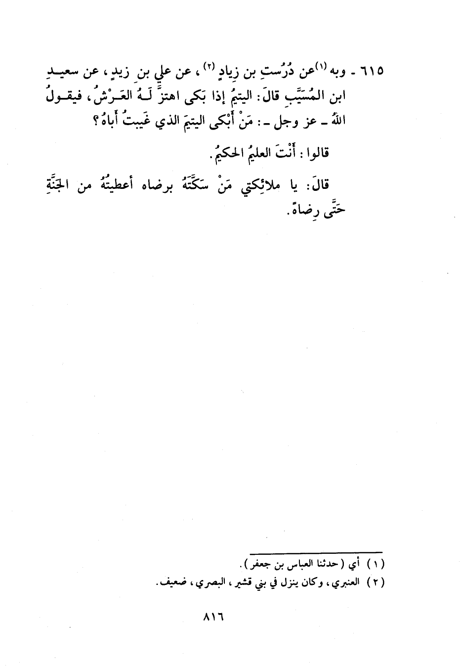 615 - وَبِهِ عَنْ دُرُسْتِ بْنِ زِيَادٍ، عَنْ عَلِيِّ بْنِ زَيْدٍ، عَنْ سَعِيدِ بْنِ الْمُسَيِّبِ، قَالَ: " §الْيَتِيمُ إِذَا بَكَى اهْتَزَّ لَهُ الْعَرْشُ فَيَقُولُ اللَّهُ عَزَّ وَجَلَّ: مَنْ أَبْكَى الْيَتِيمَ الَّذِي غَيَّبْتُ أَبَاهُ؟ قَالُوا: أَنْتَ الْعَلِيمُ الْحَكِيمُ قَالَ: يَا مَلَائِكَتِي مَنْ سَكَّتَهُ بِرِضَاهُ أَعْطَيْتُهُ مِنَ الْجَنَّةِ حَتَّى رِضَاهُ "