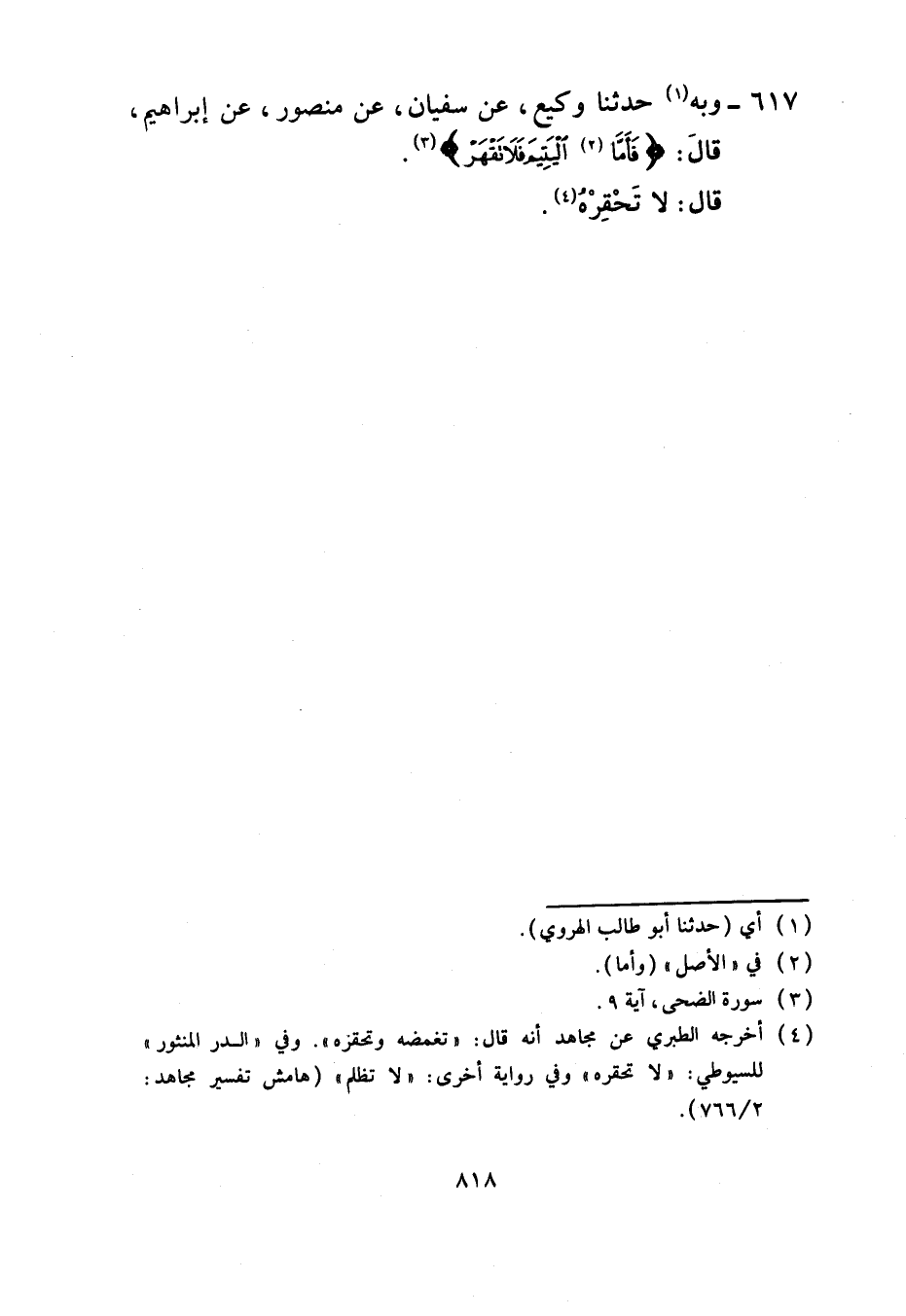 617 - وَبِهِ حَدَّثَنَا وَكِيعٌ، عَنْ سُفْيَانَ، عَنْ مَنْصُورٍ، عَنْ إِبْرَاهِيمَ، قَالَ: {فَأَمَّا الْيَتِيمَ فَلَا تقهرْ} [الضحى: 9] قَالَ: §لَا تَحْقِرْهُ