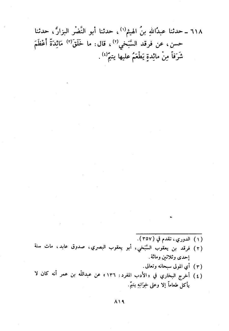 618 - حَدَّثَنَا عَبْدُ اللَّهِ بْنُ الْهَيْثَمِ، حَدَّثَنَا أَبُو النَّضْرِ الْبَزَّارُ، حَدَّثَنَا حَسَنٌ، عَنْ فَرْقَدٍ السَّبَخِيِّ، قَالَ: «§مَا خَلْقُ مَائِدَةٍ أَعْظَمُ شَرَفًا مِنْ مَائِدَةٍ يُطْعَمُ عَلَيْهَا يَتِيمٌ»