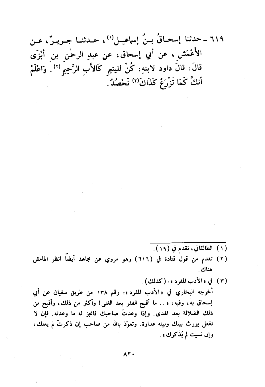 619 - حَدَّثَنَا إِسْحَاقُ بْنُ إِسْمَاعِيلَ، حَدَّثَنَا جَرِيرٌ، عَنِ الْأَعْمَشِ، عَنْ أَبِي إِسْحَاقَ، عَنْ عَبْدِ الرَّحْمَنِ بْنِ أَبْزَى، قَالَ: قَالَ دَاوُدُ لِابْنِهِ: §كُنْ لِلْيَتِيمِ كَالْأَبِ الرَّحِيمِ وَاعْلَمْ أَنَّكَ كَمَا تَزْرَعُ كَذَاكَ تَحْصُدُ