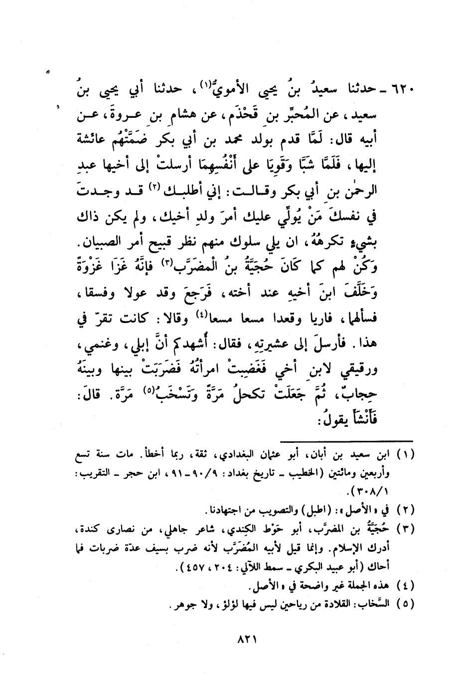 620 - حَدَّثَنَا سَعِيدُ بْنُ يَحْيَى الْأُمَوِيُّ، حَدَّثَنَا أَبِي يَحْيَى بْنُ سَعِيدٍ، عَنِ الْمُحَبَّرِ بْنِ قَحْذَمٍ، عَنْ هِشَامِ بْنِ عُرْوَةَ، عَنْ أَبِيهِ، قَالَ: لَمَّا قُدِمَ بِوَلَدِ مُحَمَّدِ بْنِ أَبِي بَكْرٍ ضَمَّتْهُمْ عَائِشَةُ إِلَيْهَا فَلَمَّا شَبَّا وَقَوِيَا عَلَى أَنْفُسِهِمَا أَرْسَلَتْ إِلَى أَخِيهَا عَبْدِ الرَّحْمَنِ بْنِ أَبِي بَكْرٍ وَقَالَتْ: إِنِّي أَطْلُبُكَ قَدْ وَجَدْتُ فِي نَفْسِكَ مَنْ يُوَلِّي عَلَيْكَ أَمْرَ وَلَدِ أَخِيكَ وَلَمْ يَكُنْ ذَاكَ بِشَيْءٍ تَكْرَهُهُ أَنْ يَلِيَ سُلُوكَ مِنْهُمْ نَظَرَ قَبِيحَ أَمْرِ الصِّبْيَانِ وَكُنْ لَهُمْ كَمَا كَانَ حُجَيَّةُ بْنُ الْمُضَرِّبِ فَإِنَّهُ غَزَا غَزْوَةً وَخَلَفَ ابْنَ أَخِيهِ عِنْدَ أُخْتِهِ فَرَجَعَ وَقَدْ عَوَّلَا وَفَسَقَا فَسَأَلَهُمَا فَأُرِيَا وَقَعَدَا مَسْعًا مَسْعًا وَقَالَا: كَانَتْ تُقِرُّ فِي هَذَا فَأَرْسَلَ إِلَى عَشِيرَتِهِ فَقَالَ: أُشْهِدُكُمْ أَنَّ إِبِلِيَ وَغَنَمِي وَرَقِيقِي لِابْنِ أَخِي فَغَضِبَتِ امْرَأَتُهُ فَضَرَبَتْ بَيْنَهَا وَبَيْنَهُ حِجَابًا ثُمَّ جَعَلَتْ تَكْحَلُ مَرَّةً وَتَسْخَبُ مَرَّةً قَالَ: فَأَنْشَأَ يَقُولُ: