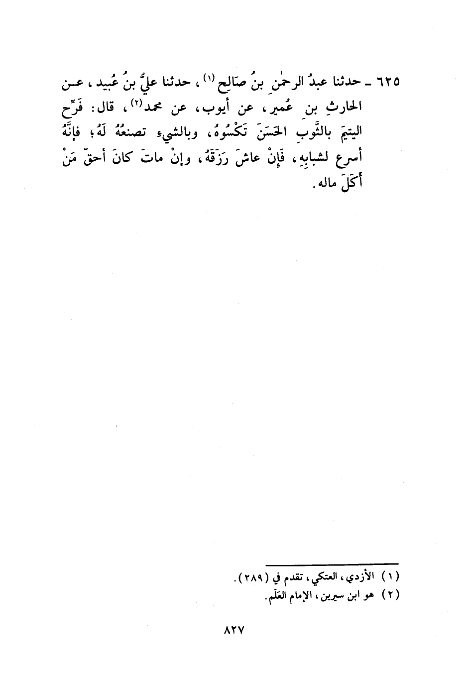 625 - حَدَّثَنَا عَبْدُ الرَّحْمَنِ بْنُ صَالِحٍ، حَدَّثَنَا يَعْلَى بْنُ عُبَيْدٍ، عَنِ الْحَارِثِ بْنِ عُمَيْرٍ، عَنْ أَيُّوبَ، عَنْ مُحَمَّدٍ، قَالَ: §فَرِّحِ الْيَتِيمَ بِالثَّوْبِ الْحَسَنِ تَكْسُوهُ وَبِالشَّيْءِ تَصْنَعُهُ لَهُ فَإِنَّهُ أَسْرَعُ لِشَبَابِهِ فَإِنْ عَاشَ رُزِقَهُ وَإِنْ مَاتَ كَانَ أَحَقَّ مَنْ أَكَلَ مَالَهُ