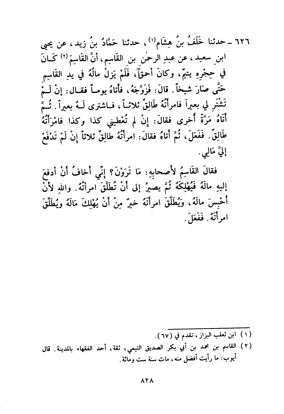 626 - حَدَّثَنَا خَلَفُ بْنُ هِشَامٍ، حَدَّثَنَا حَمَّادُ بْنُ زَيْدٍ، عَنْ يَحْيَى بْنِ سَعِيدٍ، عَنْ عَبْدِ الرَّحْمَنِ بْنِ الْقَاسِمِ، أَنَّ الْقَاسِمَ §كَانَ فِي حِجْرِهِ يَتِيمٌ وَكَانَ أَحْمَقَ فَلَمْ يَزَلْ مَالُهُ فِي يَدِ الْقَاسِمِ حَتَّى صَارَ شَيْخًا قَالَ: فَزَوَّجَهُ فَأَتَاهُ يَوْمًا فَقَالَ: إِنْ لَمْ تَشْتَرِ لِي بَعِيرًا فَامْرَأَتُهُ طَالِقٌ ثَلَاثًا فَاشْتَرَى لَهُ بَعِيرًا ثُمَّ أَتَاهُ مَرَّةً أُخْرَى فَقَالَ: إِنْ لَمْ تُعْطِنِي كَذَا وَكَذَا فَامْرَأَتُهُ طَالِقٌ فَفَعَلَ ثُمَّ أَتَاهُ فَقَالَ: امْرَأَتُهُ طَالِقٌ ثَلَاثًا إِنْ لَمْ تَدْفَعْ إِلَيَّ مَالِي فَقَالَ الْقَاسِمُ لِأَصْحَابِهِ: مَا تَرَوْنَ إِنِّي أَخَافُ أَنْ أَدْفَعَ إِلَيْهِ مَالَهُ فَيُهْلِكَهُ ثُمَّ يَصِيرَ إِلَى أَنْ تُطَلَّقَ امْرَأَتُهُ، وَاللَّهِ لَأَنْ أَحْبِسَ مَالَهُ وَيُطَلِّقَ امْرَأَتَهُ خَيْرٌ مِنْ أَنْ يُهْلِكَ مَالَهُ وَيُطَلِّقَ امْرَأَتَهُ فَفَعَلَ