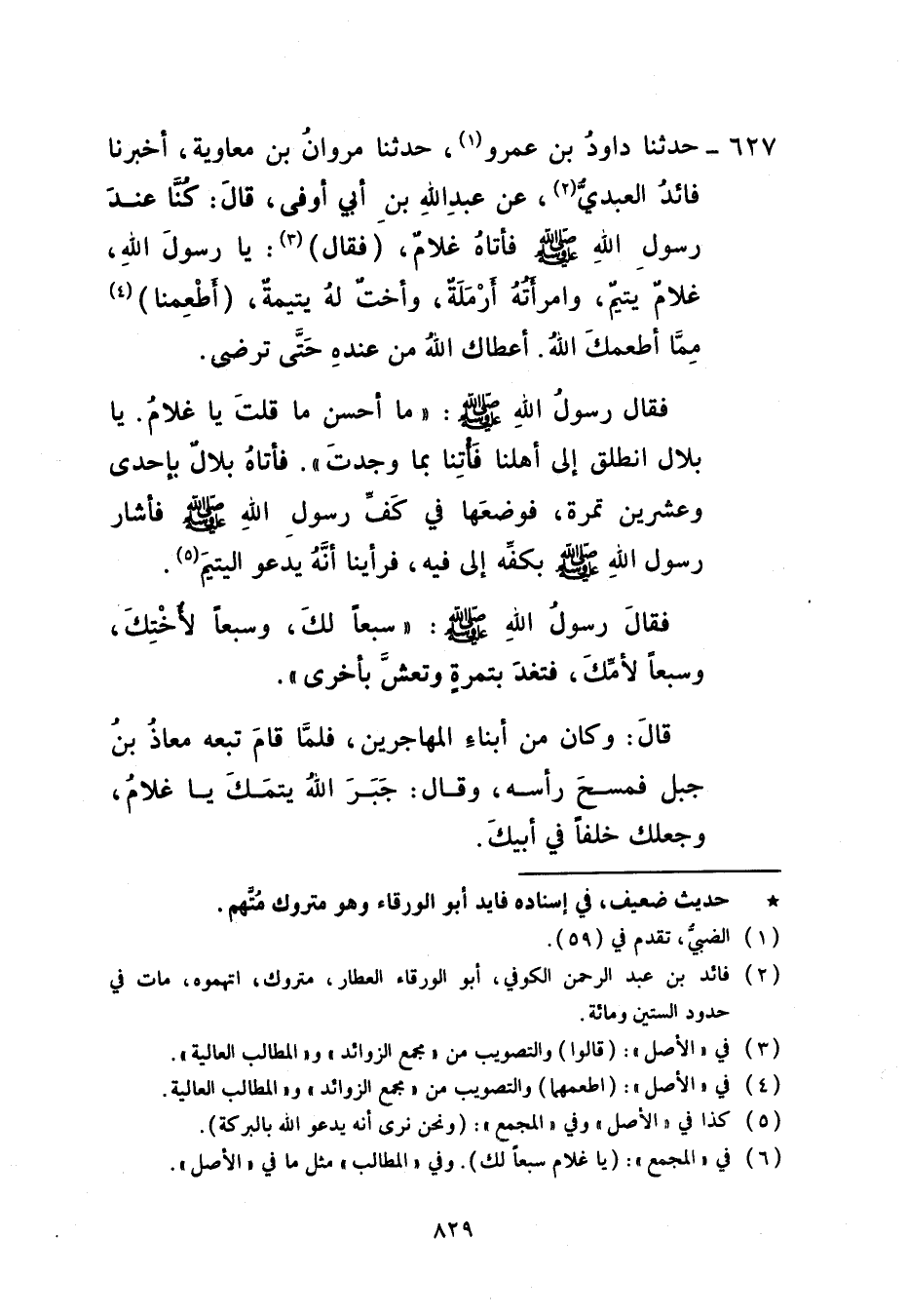 627 - حَدَّثَنَا دَاوُدُ بْنُ عَمْرٍو، حَدَّثَنَا مَرْوَانُ بْنُ مُعَاوِيَةَ، أَخْبَرَنَا فَائِدٌ الْعَبْدِيُّ، عَنْ عَبْدِ اللَّهِ بْنِ أَبِي أَوْفَى، قَالَ: كُنَّا عِنْدَ رَسُولِ اللَّهِ صَلَّى اللهُ عَلَيْهِ وَسَلَّمَ فَأَتَاهُ غُلَامٌ فَقَالَ: يَا رَسُولَ اللَّهِ، غُلَامٌ يَتِيمٌ وَامْرَأَتُهُ أَرْمَلَةٌ وَأُخْتٌ لَهُ يَتِيمَةٌ أَطْعِمْنَا مِمَّا أَطْعَمَكَ اللَّهُ، أَعْطَاكَ اللَّهُ مِنْ عِنْدِهِ حَتَّى تَرْضَى فَقَالَ رَسُولُ اللَّهِ صَلَّى اللهُ عَلَيْهِ وَسَلَّمَ: «مَا أَحْسَنَ مَا قُلْتَ يَا غُلَامُ، يَا بِلَالُ، انْطَلِقْ إِلَى أَهْلِنَا فَأْتِنَا بِمَا وَجَدْتَ» فَأَتَاهُ بِلَالٌ بِإِحْدَى وَعِشْرِينَ تَمْرَةً فَوَضَعَهَا فِي كَفِّ رَسُولِ اللَّهِ صَلَّى اللهُ عَلَيْهِ وَسَلَّمَ فَأَشَارَ رَسُولُ اللَّهِ صَلَّى اللهُ عَلَيْهِ وَسَلَّمَ بِكَفِّهِ إِلَى فِيهِ فَرَأَيْنَا أَنَّهُ يَدْعُو الْيَتِيمَ فَقَالَ رَسُولُ اللَّهِ صَلَّى اللهُ عَلَيْهِ وَسَلَّمَ: «سَبْعًا لَكَ وَسَبْعًا لِأُخْتِكَ وَسَبْعًا لِأُمِّكَ فَتَغَّدَّ بِتَمْرَةٍ وَتَعَشَّ بِأُخْرَى» قَالَ: وَكَانَ مِنْ أَبْنَاءِ الْمُهَاجِرِينَ فَلَمَّا قَامَ تَبِعَهُ مُعَاذُ بْنُ جَبَلٍ فَمَسَحَ رَأْسَهُ وَقَالَ: جَبَرَ اللَّهُ يُتْمَكَ يَا غُلَامُ وَجَعَلَكَ خَلَفًا فِي أَبِيكَ -[830]-، فَقَالَ رَسُولُ اللَّهِ صَلَّى اللهُ عَلَيْهِ وَسَلَّمَ: «يَا مُعَاذُ قَدْ رَأَيْتُكَ مَا صَنَعْتَ بِالْغُلَامِ؟» فَقَالَ: رَحْمَةً لَهُ يَا رَسُولَ اللَّهِ، فَقَالَ رَسُولُ اللَّهِ صَلَّى اللهُ عَلَيْهِ وَسَلَّمَ: «وَالَّذِي نَفْسِي بِيَدِهِ §لَا يُطْعِمُ رَجُلٌ مِنَ الْمُسْلِمِينَ يَتِيمًا فَيُحْسِنُ وِلَايَتَهُ ثُمَّ يَضَعُ يَدَهُ عَلَى رَأْسِهِ إِلَّا كَتَبَ اللَّهُ لَهُ بِكُلِّ شَعْرَةٍ عَشْرَ حَسَنَاتٍ وَكَفَّرَ عَنْهُ بِكُلِّ شَعْرَةٍ عَشْرَ سَيِّئَاتٍ وَرَفَعَهُ بِكُلِّ شَعْرَةٍ عَشْرَ دَرَجَاتٍ»