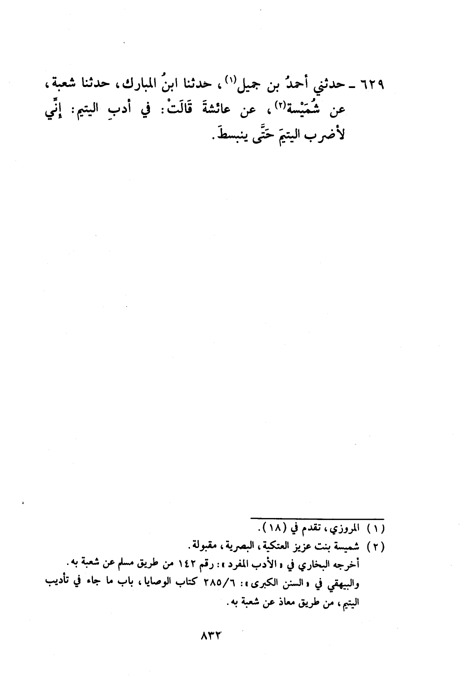 629 - حَدَّثَنِي أَحْمَدُ بْنُ جَمِيلٍ، حَدَّثَنَا ابْنُ الْمُبَارَكِ، حَدَّثَنَا شُعْبَةُ، عَنْ شُمَيْسَةَ، عَنْ عَائِشَةَ، قَالَتْ فِي أَدَبِ الْيَتِيمِ: إِنِّي §لِأَضْرِبُ الْيَتِيمَ حَتَّى يَنْبَسِطَ
