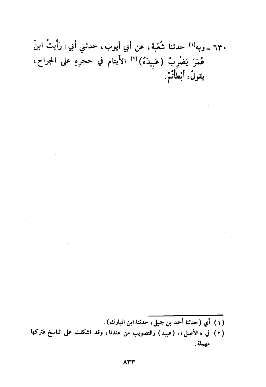 630 - وَبِهِ حَدَّثَنَا شُعْبَةُ، عَنْ أَبِي أَيُّوبَ، حَدَّثَنِي أَبِي: " رَأَيْتُ ابْنَ عُمَرَ §يَضْرِبُ عَبِيدَهُ الْأَيْتَامَ فِي حِجْرِهِ عَلَى الْجِرَاحِ يَقُولُ: أَبْطَأْتُمْ "