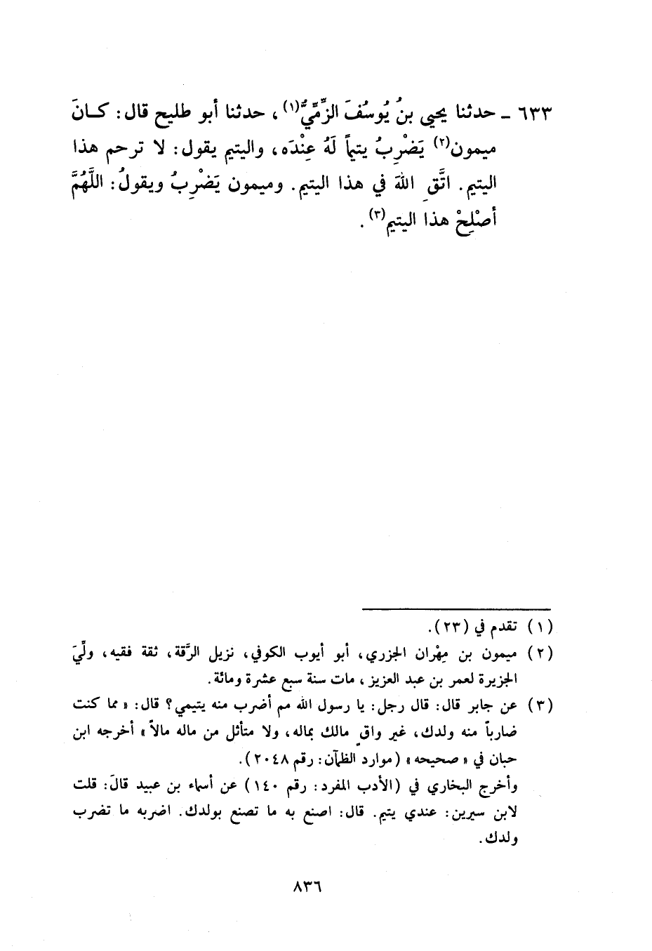 633 - حَدَّثَنَا يَحْيَى بْنُ يُوسُفَ الزِّمِّيُّ، حَدَّثَنَا أَبُو طُلَيْحٍ، قَالَ: كَانَ مَيْمُونٌ يَضْرِبُ يَتِيمًا لَهُ عِنْدَهُ وَالْيَتِيمُ يَقُولُ: §لَا تَرْحَمُ هَذَا الْيَتِيمَ اتَّقِ اللَّهَ فِي هَذَا الْيَتِيمِ، وَمَيْمُونٌ يَضْرِبُ وَيَقُولُ: «اللَّهُمَّ أَصْلِحْ هَذَا الْيَتِيمَ»
