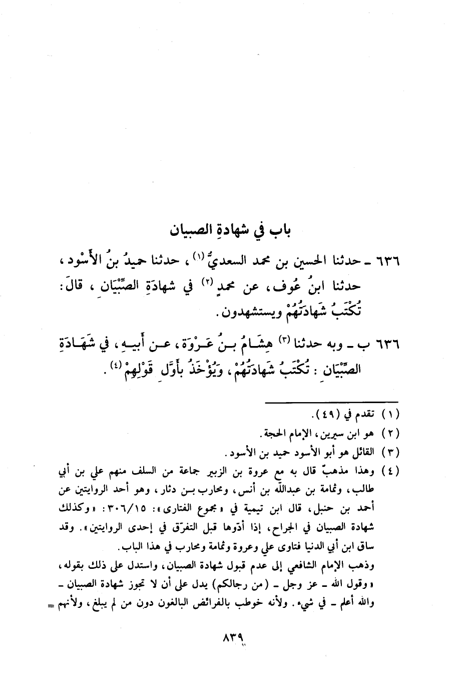 حَدَّثَنَا الْحُسَيْنُ بْنُ مُحَمَّدٍ السَّعْدِيُّ، حَدَّثَنَا حُمَيْدُ بْنُ الْأَسْوَدِ، حَدَّثَنَا ابْنُ عَوْفٍ، عَنْ مُحَمَّدٍ فِي شَهَادَةِ الصِّبْيَانِ قَالَ: «§تُكْتَبُ شَهَادَتُهُمْ وَيُسْتَشْهَدُونَ»